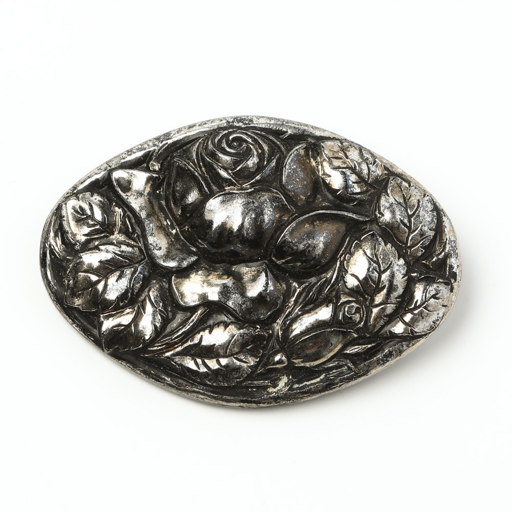 薔薇は女性にとって永遠のモチーフ・・・大きな一輪の薔薇がモチーフになった大振りのガラスのブローチです。今では制作ができないと言われているジェットガラス(太陽の光も通さない漆黒のガラスです)を使用し、楕円形の表面には薔薇とリーフが形成されています。下地の黒のお色の上に銀メッキが施され、美しい陰影が表現されています。このタイプは1930年代頃から1960年代頃までチェコで作られたブローチで、こちらはデッドストックの貴重なブローチです。5.2cmと大きめで堂々とした存在感のあるお品です。帯留めなどに加工されるのもおすすめです。状態は新品のように良いものです。手作りの温かみも感じられる逸品です。