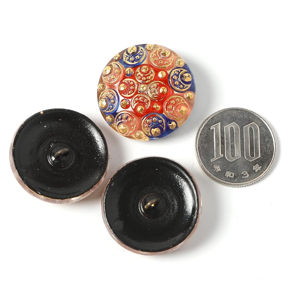 こちらはチェコのガラスボタン工房から入荷した手打ちのガラスボタン。ポッコリとした厚めのガラスで、透明のガラスですが裏から紺色、赤、ピンクの賑やかでキュートな彩色が施されてます。表面には金彩で月の輪のような模様が入っていて、全体的にデザイン性の高い個性的な仕上がりです。和装などにも合いそうな雰囲気で、帯留などにも良いかもしれません。髪留めなどにもおすすめです、もちろん飾りボタンとしても。
