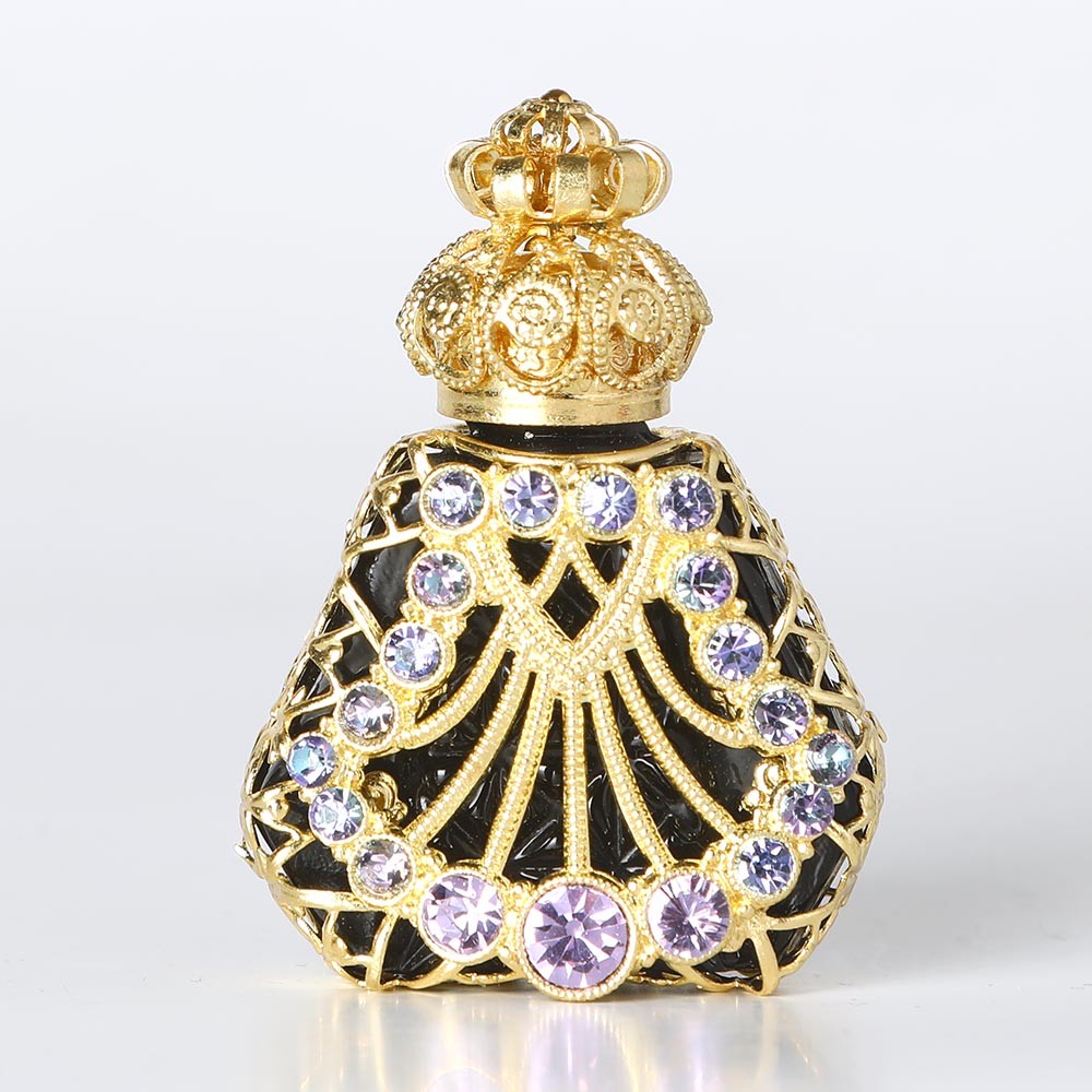 こちらはチェコのガラス製香水瓶で昔から作られているチェコスロヴァキアでは定番の商品。ガラスを型にはめてフォーミングする製法で作られています。また、北チェコの工房で一つの家族が丁寧に手作業で製作している工芸品的な香水瓶です。黒ガラスを使用した瓶は変形6角形、レースのようなフィリグリーのゴールドの金属カバー、表面にはブルーとパープルのカットガラスがあしらわれた豪華な作りの香水瓶です。カットガラスが中央でキラキラと華やかに輝きます。また蓋には内部にガラス棒が付いていて香水に浸る感じになります。お気に入りの香水を小分けにして携帯することも可能です。また、棚などに飾ると華やか抜群で可愛らしいインテリア・アイテムになります。新品&ノスタルジックな香水瓶、とてもチェコらしい一品です。またプレゼントとしてもおすすめです。