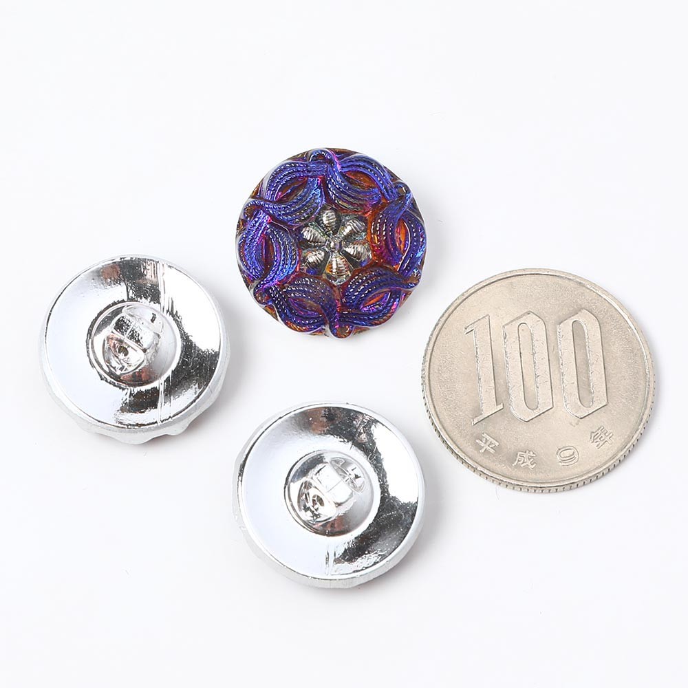 こちらは工房からの新作のガラスボタンです。1.8cmの直径で裏から金属塗料が塗布され、奥行きのあるパープルとオレンジのお色です。中央には銀彩でお花のモチーフが施されています。小さいけどとても華やかなボタンです。髪留めなど装いのアクセントにおすすめです。