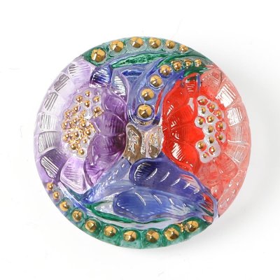 こちらはお馴染みのひまわりのデザインのガラスボタン。透明なガラスを使用し裏から塗料で彩色が施されています。パープルや紅色、グリーンなどのカラフルな彩色で明るい雰囲気です。ガラス自体の質感もお楽しみいただける涼やかな仕上がり。髪留め、帯留めなどにもおすすめです。