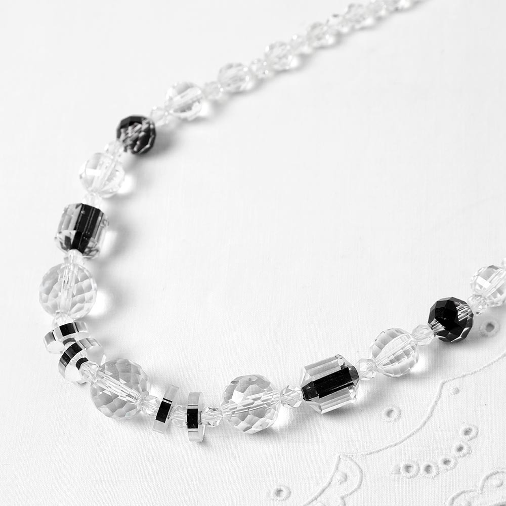 こちらは1920-30年代のヴィンテージ・クリスタルガラス・ネックレス。こちらのクリスタルガラスのビーズはかつて職人さんが一つ一つハンドカットで製作した大変貴重なネックレスです。円筒の表面には細かな面取りが施され、光をキラキラと反射します。大きなガラスビーズは大きさ1.3cm強、また筒状のビーズにはブラックのガラスがあしらわれ、キリッとモノトーンで美しい仕上がり。目立ったかけもなく全体の状態も素晴らしいものです。一見すると90-100年も古いとは思えないとてもモダーンなデザインのネックレスかと思います。チェコのビジュー美術館にも同じスタイルのハンドカットのクリスタルガラスのネックレスが展示されている非常に貴重なネックレスです。工房で出荷の紙に包まれた状態で入荷したデッドストックです。職人さんの技が光る秀品です。パーツもレストアされていますので、糸切れの心配もございません。