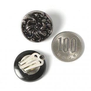 こちらはガラスのクリップタイプのイヤリング。ガラスボタンにも見られる花模様のイヤリングです。模様の上から銀彩で施されています。シックでエレガントな雰囲気の一品。後ろのクリップパーツも状態も焼けや変色などなく良好です。