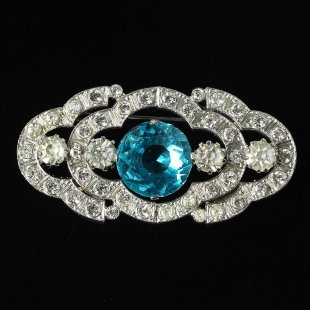 こちらはチェコスロヴァキア1920年代のアール・デコ・ブローチ。5.2cmと大振りの存在感のあるお品です。現在でも通用する大変モダンなデザインに仕上がっています。中央には大きなラウンドのクリアブルーのガラス石があしらわれ、また台座には小さなクリスタルガラスが配置されとても華やかです。ノーブルでエレガントなアール・デコの秀品です。1920-30年代のアール・デコ・アクセサリーはヨーロッパでも人気のコレクターズ・アイテム。ピンの状態も良好です。特別なシーンにパッと目を惹く主役級のアクセントになります。