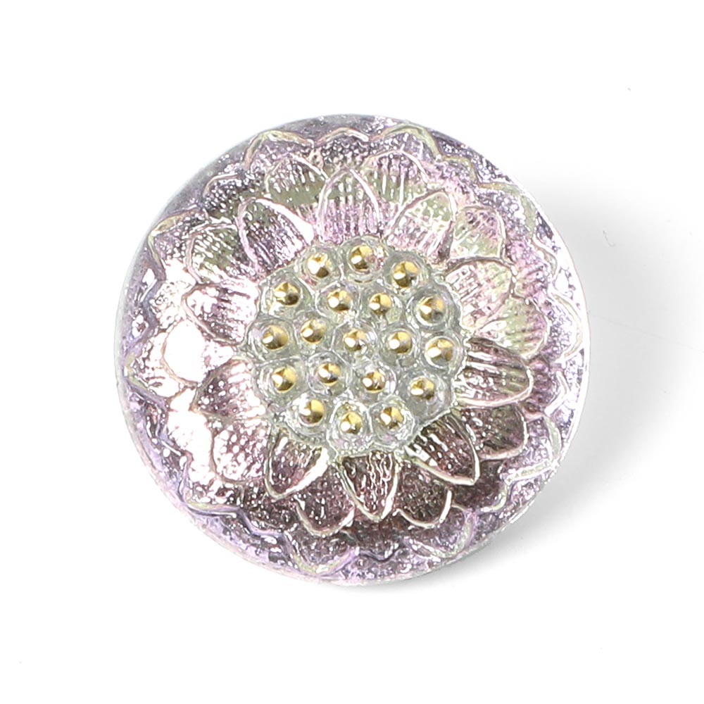 こちらは北チェコのガラスボタン工房で作られている手打ちガラスボタン。直径が約1.8cmあります。一つ一つ打ち出しや彩色も職人さんの手作業で行われるガラスボタンです。裏から塗料が塗布されています。そのため奥行きのある輝きです。お色は紫がかった淡いピンク色です。お花には金彩でドットも模様も入れられて華やか・・・。ガーリーで優しい雰囲気のお品です。