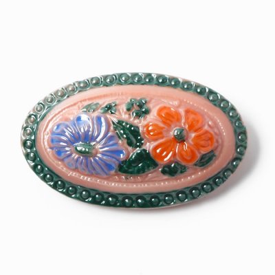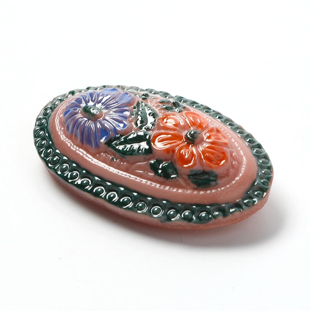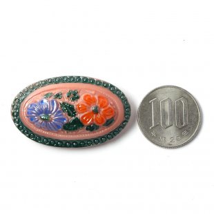 こちらは15年ほど前に入荷したガラスボタンの中に一つだけあったお色のガラスボタン。楕円形で立体的な作りをした花柄のボタンです。ピンクのガラスも昨今かなり貴重なマテリアルとなってきていて、その意味でも珍しいお品です。オレンジと青いお花でデザインは少しオリエンタルな雰囲気もありますので、帯留めなどにもおすすめです。状態も良いものです。