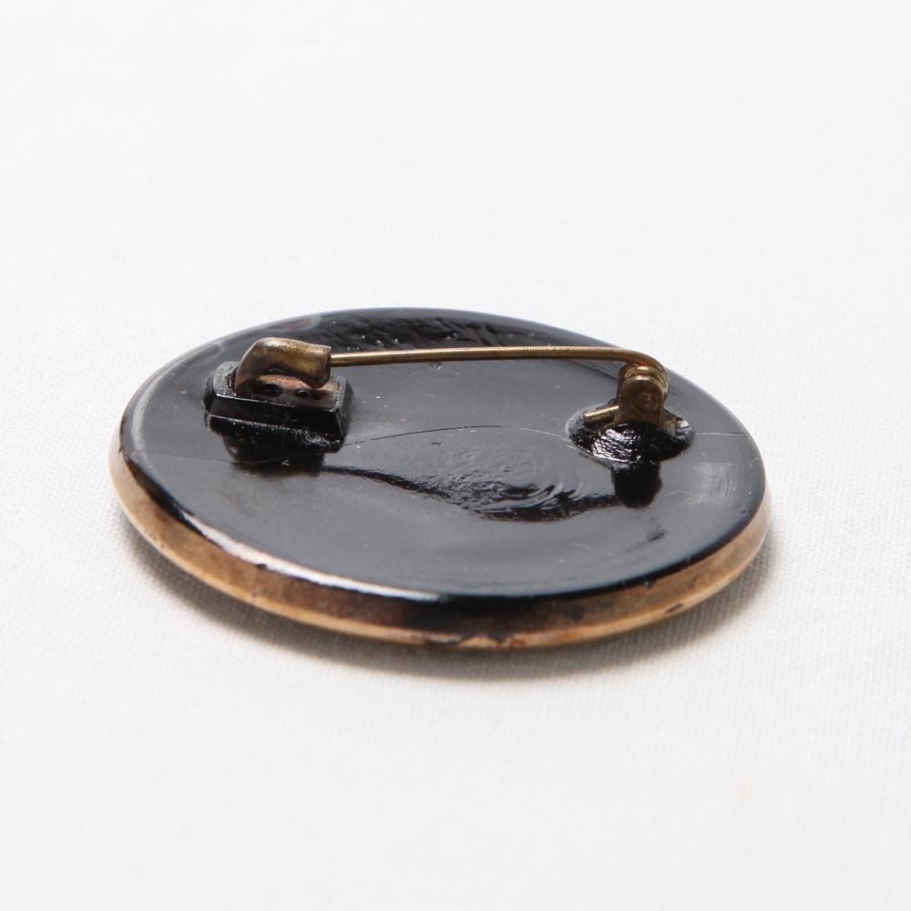 こちらはチェコの黒ガラスのブローチ。チェコの古い黒ガラスはその濃さが太陽をかざしてみても光を通さないほどの色の濃さがあり、こちらでもコレクターのカテゴリーをなしています。今では使用できない特別な薬品を使用して製造していたため、今ではもう作れないものだそう。こちらもその貴重な黒ガラスです。こちらはその表面に金色の塗装が施されています。正面には三銃士のような、大きな帽子をかぶった長髪の少年の横顔。チェコらしいデザインの一つといえますが、日本ではなかなかお目にかからない変わったデザインです。金色の装飾に剥げが見られます。古いもので1930年代ごろの物と思われます。個性のあるおしゃれの好きな方におすすめの一品です。後ろのピンも問題ございません。表面の金のメッキに経年の擦れが見られます。