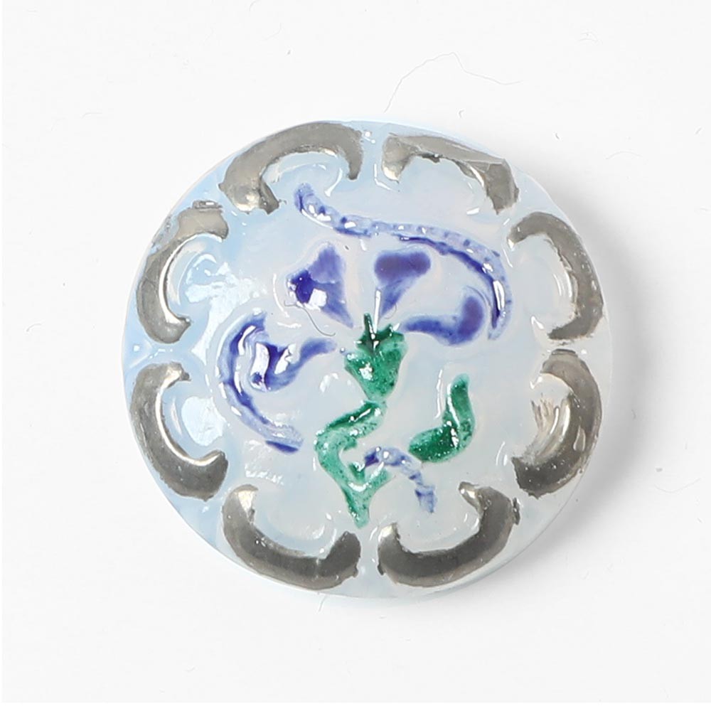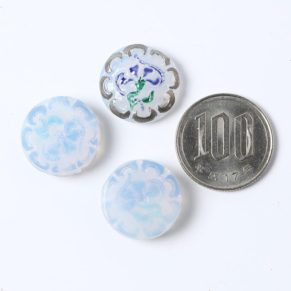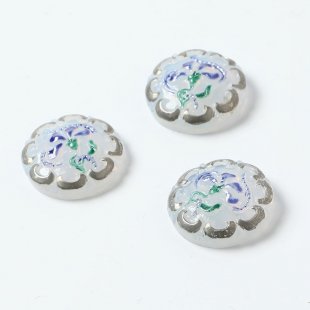 こちらは北チェコでガラスボタン工房で製作されたガラスカボション。ひとつひとつ手で打ち出され彩色も職人さんによる手作業でのものです。直径は1.8cmです。こちらは緩やかに中央の盛り上がった表面にバロック調のカービーな植物紋様が銀彩で施されています。優雅でノスタルジックなデザインです。石鹸水のような乳白色のガラスを使用したちょっと珍しいお品です。