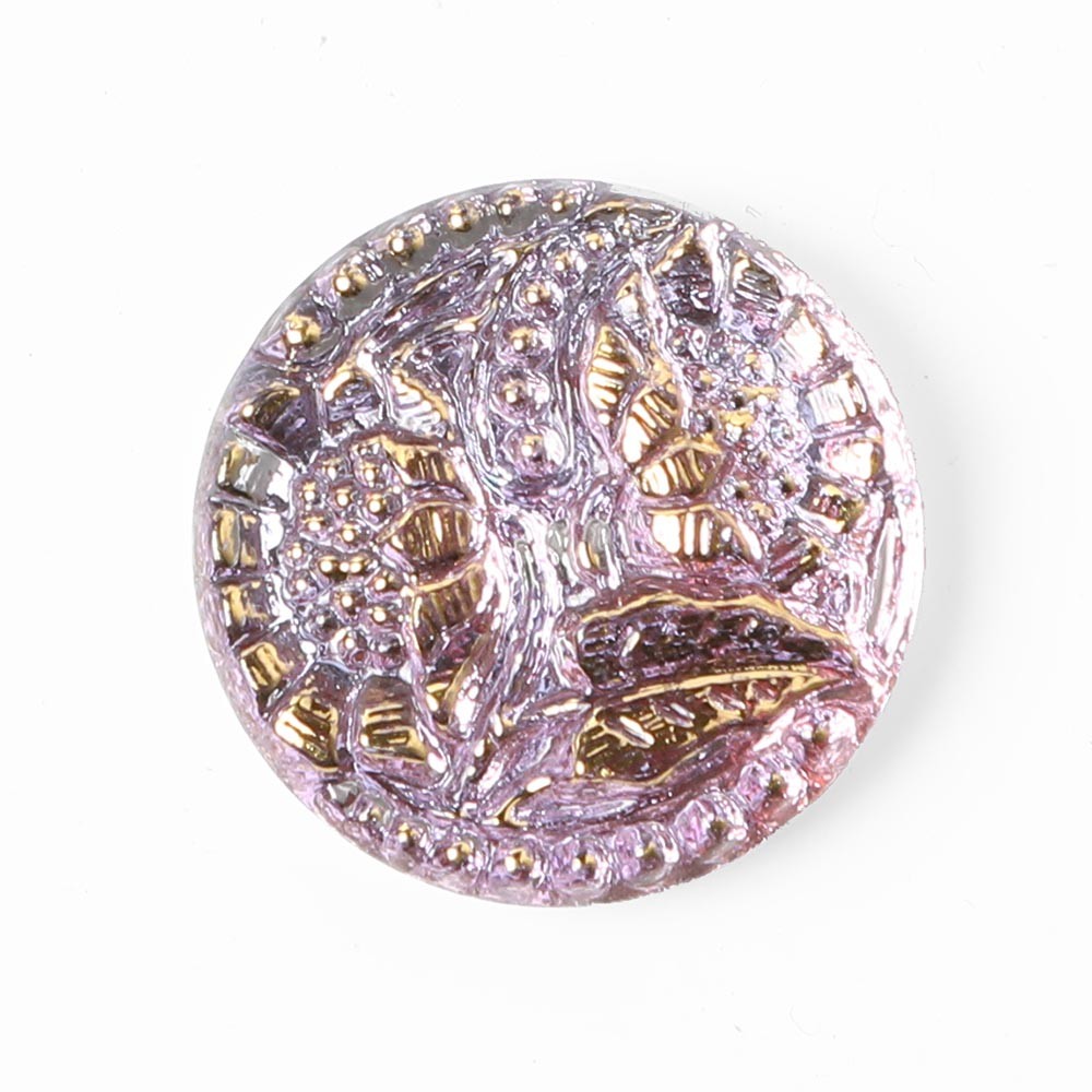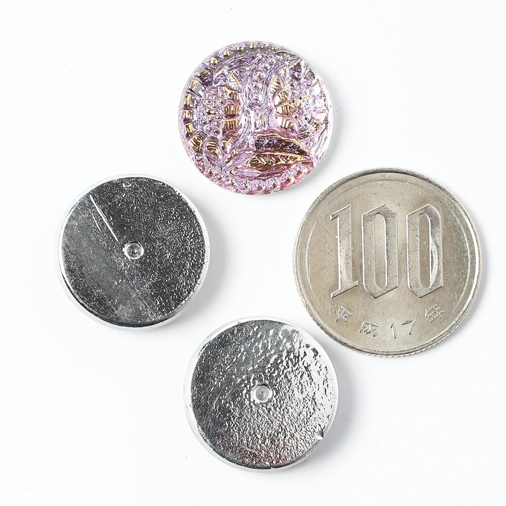 こちらは北チェコでガラスボタン工房で製作されたガラスカボション。ひとつひとつ手で打ち出され彩色も職人さんによる手作業でのものです。直径は1.8cmです。こちらはひまわりモチーフ、裏面には金属塗料が塗布され柔らかなピンクのお色、表面には金彩が施されています。華やかでガーリーなお品です。