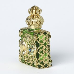 こちらはチェコのガラス製香水瓶で昔から作られているチェコスロヴァキアでは定番の商品。ガラスを型にはめてフォーミングする製法で作られています。また、北チェコの工房で一つの家族が丁寧に手作業で製作している工芸品的な香水瓶です。透明グリーンのガラスを使用した瓶は正方形、レースのようなフィリグリーのゴールドの金属カバー、中央にはブルーや黄緑色のカットガラスがあしらわれた豪華な作りの香水瓶です。また蓋には内部にガラス棒が付いていて香水に浸る感じになります。お気に入りの香水を小分けにして携帯することも可能です。また、棚などに飾ると華やか抜群で可愛らしいインテリア・アイテムになります。新品&ノスタルジックな香水瓶、とてもチェコらしい一品です。またプレゼントとしてもおすすめです。