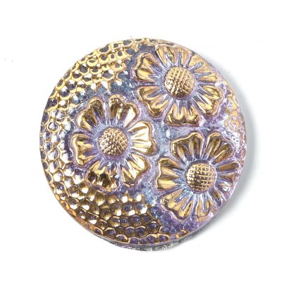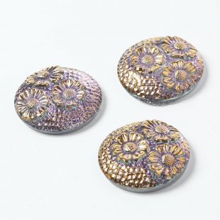 昔ながらの製法で制作されている手打ちガラスカボション。職人さんの手作りで再入荷品です。表面にはひなぎくのお花が3つ、また鎚目加工の様な細かな模様がはいっています。裏から金属塗料が塗布され、また表面からは金色の塗料が塗布されています。お色は人気のヴィトレイルカラー。ブルーやパープルのお色が混ざり合う美しいカラーです。ちょっとアールデコな懐かしい雰囲気も持っているお品です。ブローチや帯留めなどにするのもアイディアです。