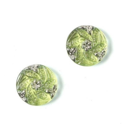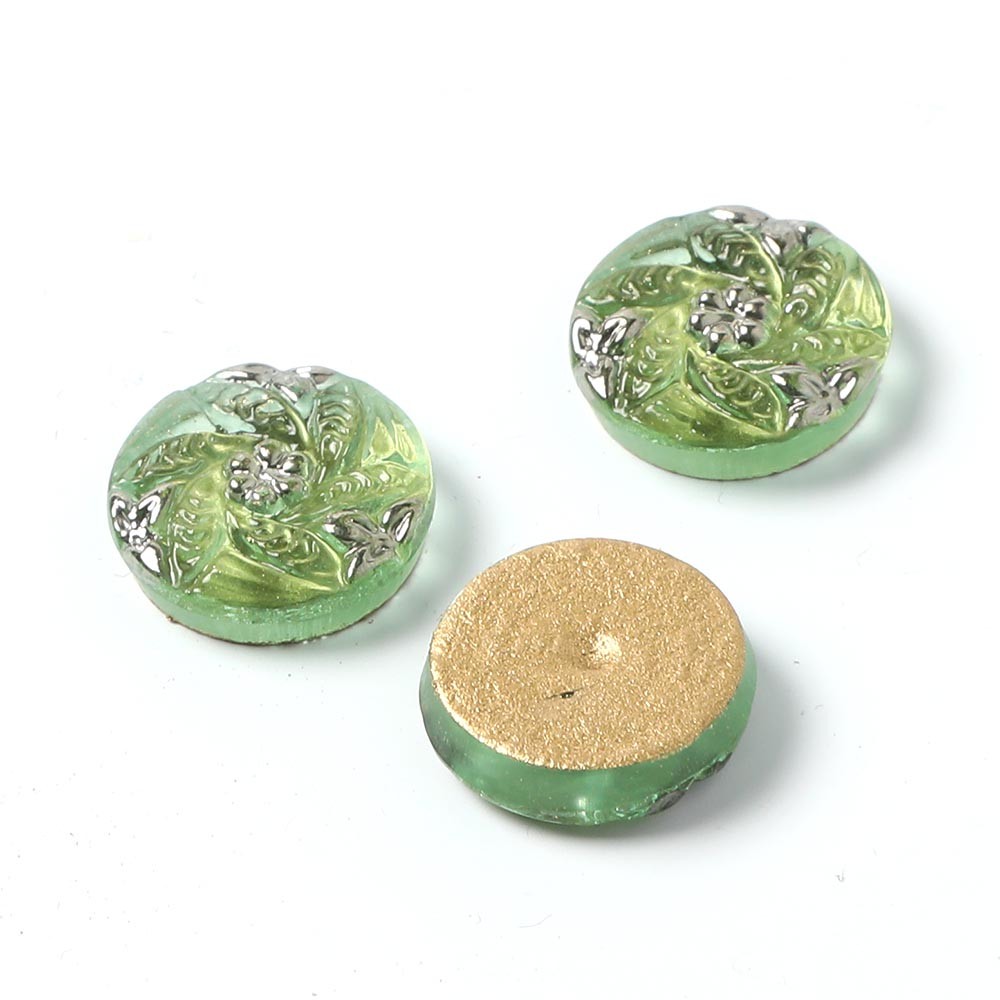 こちらは北チェコのガラスボタン工房で作られている手打ちのガラス・カボションです。こちらのカボションは直径が約1.3cmあります。一つ一つ打ち出しや彩色も職人さんの手作業で行われています。裏から金属塗料が施され、お色は奥行きのある黄緑色です。花ぐるまのデザインで、銀彩も施されています。爽やかな雰囲気のガラスカボションです。こちらは2個売りですのでご留意ください。ガラスボタンと同じデザインですが、裏には糸通しのリングがないため、アクセ・パーツとして使用される方には大変便利です。