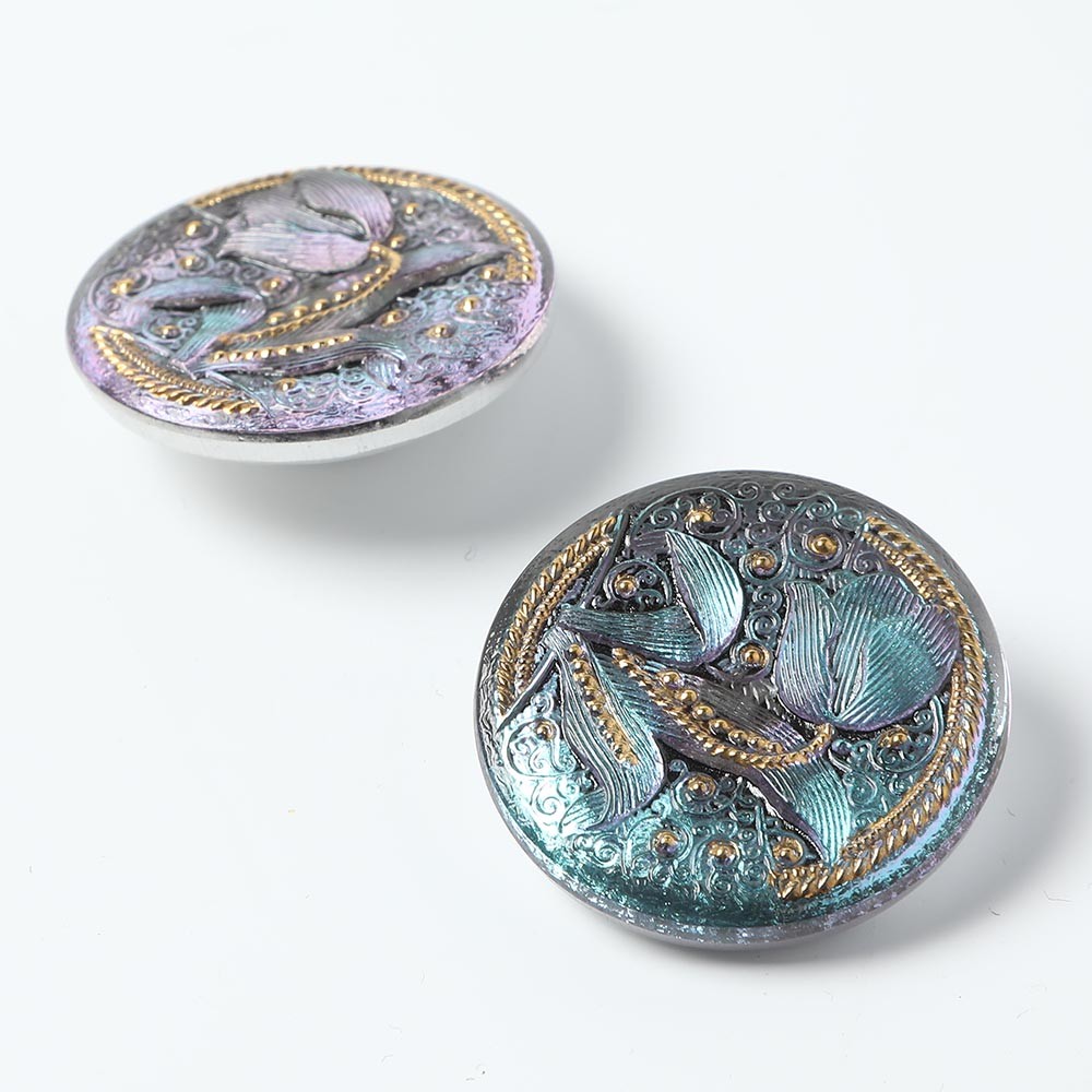 こちらは北チェコのガラスボタン工房で作られている手打ちガラスボタン。直径が約3.2から3.3cmあります。一つ一つ手作業による手打ちで行われ、手間をかけて作られたガラスボタンです。定番のチューリップのデザインです。裏から金属で裏打ちされ、内側からヴィトレイル・ブルーのお色です。表面の金彩もエレガントな雰囲気を添えます。涼やかでブローチのような貫禄があり留め具などにするととても素敵です。帯留めなどにリメイクするのもありです。