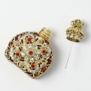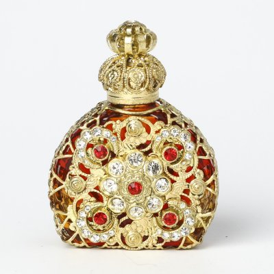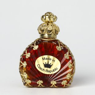 こちらはチェコのガラス製香水瓶で昔から作られているチェコスロヴァキアでは定番の商品。ガラスを型にはめてフォーミングする製法で作られています。また、北チェコの工房で一つの家族が丁寧に手作業で製作している工芸品的な香水瓶です。扇型のコーラルレッドの香水瓶です。表面にはレースのようなフィリグリーの装飾、またカットガラスも散りばめられています。蓋には内部にガラス棒が付いていて香水に浸る感じになります。大変豪華で存在感があります。お気に入りの香水を小分けにして携帯することも可能です。また、棚などに飾ると華やかで可愛らしいインテリア・アイテムになります。新品&ノスタルジックな香水瓶、とてもチェコらしい一品です。またプレゼントとしてもおすすめです。