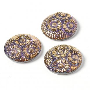昔ながらの製法で制作されている手打ちガラスカボション。職人さんの手作りです。表面にはひなぎくのお花が3つ、また鎚目加工の様な細かな模様がはいっています。裏から金属塗料が塗布され、また表面からは金色の塗料が塗布されています。お色は人気のヴィトレイルカラー。ブルーやパープルのお色が混ざり合う美しいカラーです。ちょっとアールデコな懐かしい雰囲気も持っているお品です。ブローチや帯留めなどにするのもアイディアです。