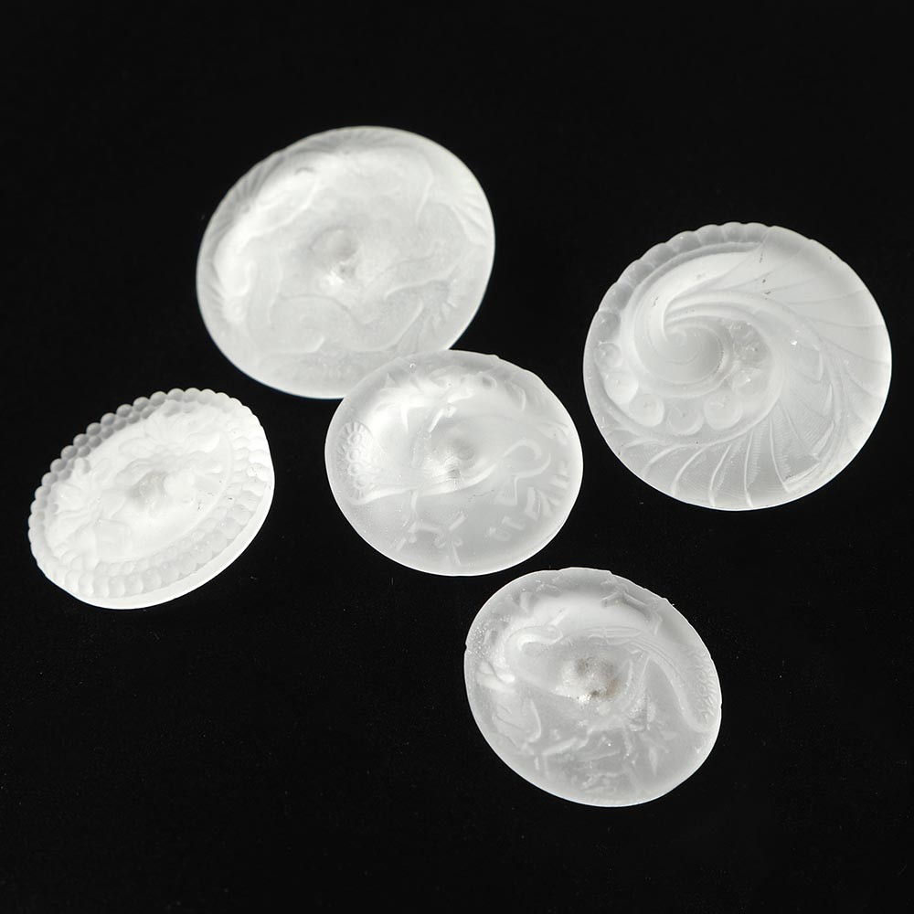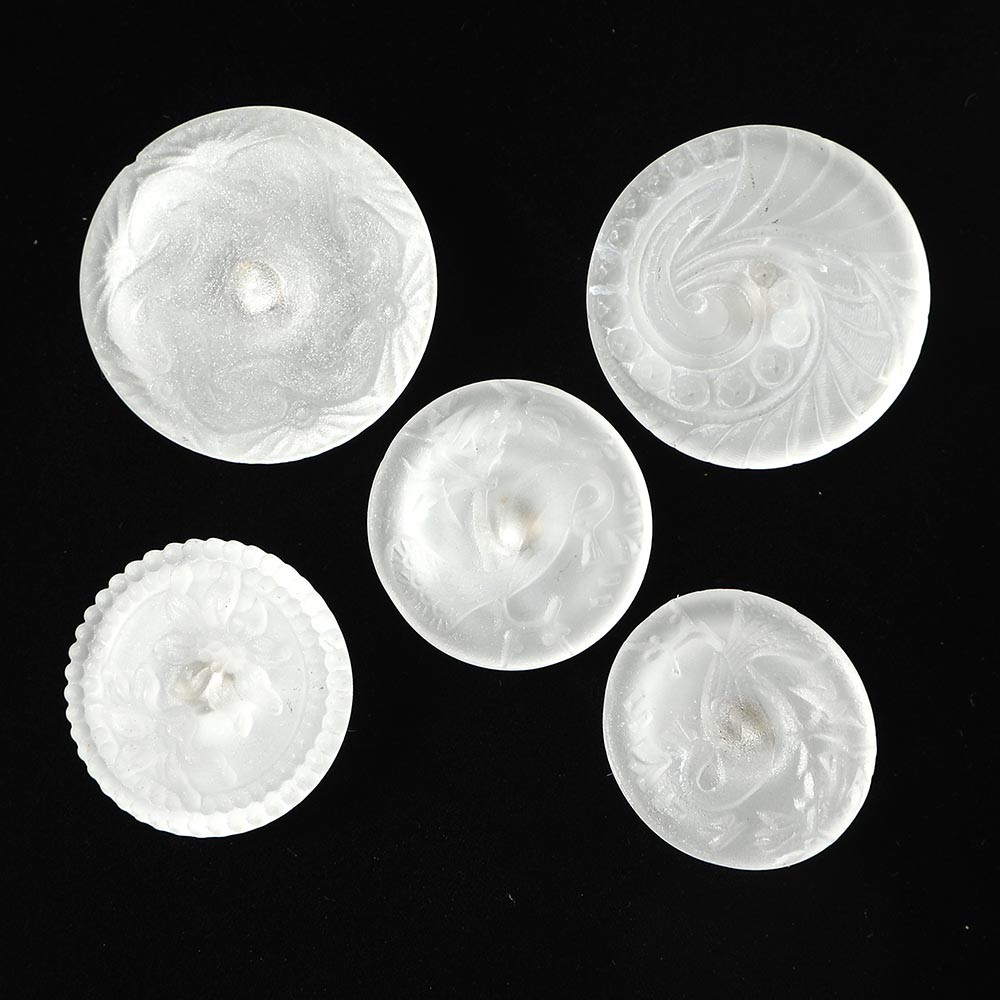 こちらはちょっと珍しいフロストガラスのボタン。霜か降ったような濁った白いお色のガラスです。半透明の柔らかな模様の陰影がとても美しい上品でシックなボタンに仕上がっています。バーボフカで長年集めてセットにした5つのセットでご提供です。2.7cm と2.2cmの大きさです。孔雀の模様の2.2cmのボタンの裏面きわにごく小さなかけがあります。