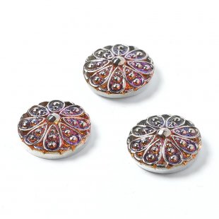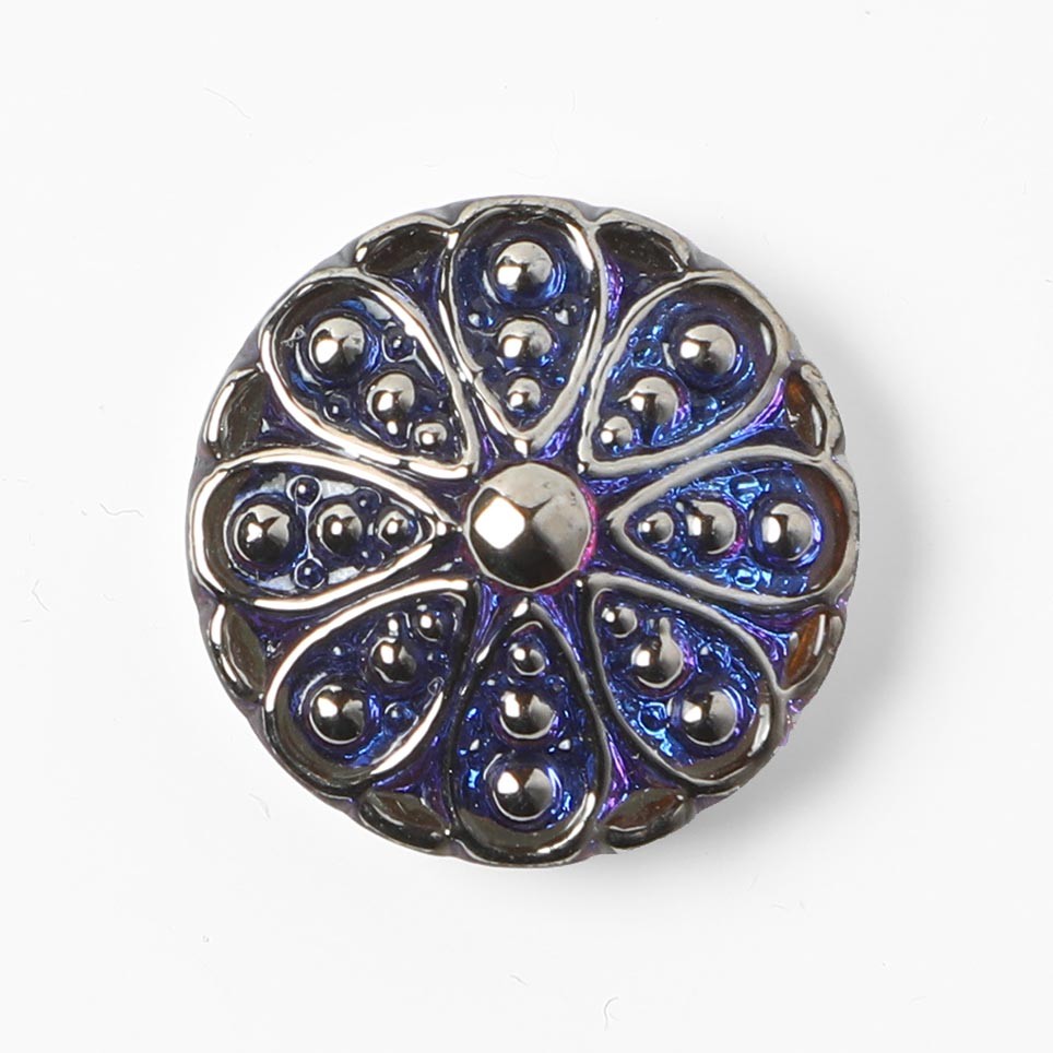 こちらは北チェコのガラスボタン工房で作られている手打ちカボション。直径は約1.8cm。裏から金属塗料が塗布され、奥行きのあるブルーの色です。表面にオプティカルフラワーの細かな模様がシルバーで施されています。陰影の美しい、品のある美しい仕上がりです。手作りのため、陰影が若干ですが異なり、カボションの厚みも少しずつ異なりますのでご留意ください。