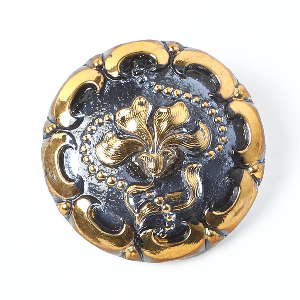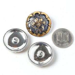 こちらは北チェコでガラスボタン工房で製作されたガラスボタン。手で打ち出され彩色も職人さんによる手作業でのものです。直径は2.7cmある大きめのボタンで存在感があります。こちらは緩やかに中央の盛り上がった表面にバロック調のカービーな植物紋様が金彩で施されています。お色は彩度を抑えた上品なシルバーパープル。優雅でノスタルジックな雰囲気です。裏面から金属塗料が塗布され、奥行きのあるピンクパープルのお色です。工芸品と言える大変手間のかかった一品でブローチ、帯留めにしても素敵です。