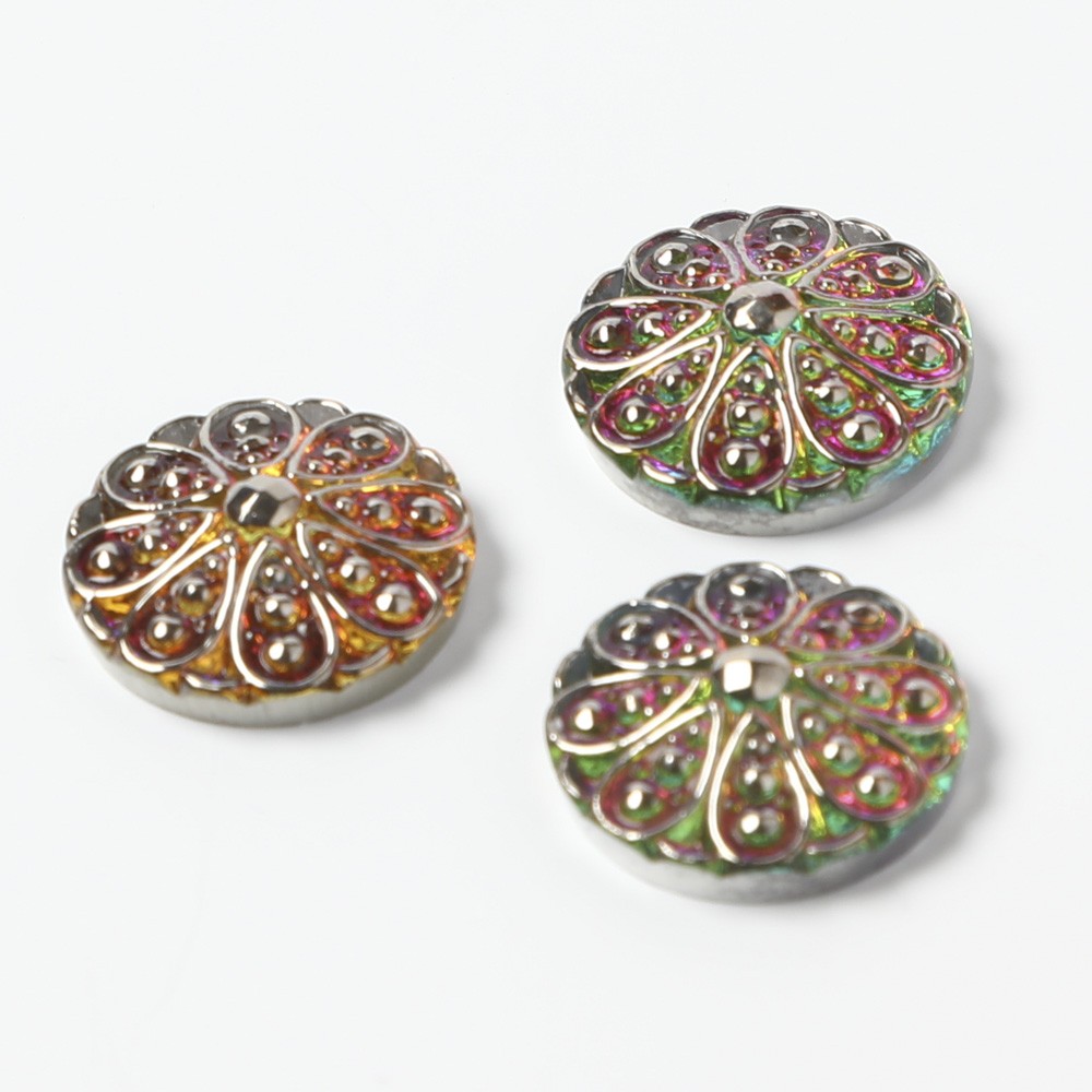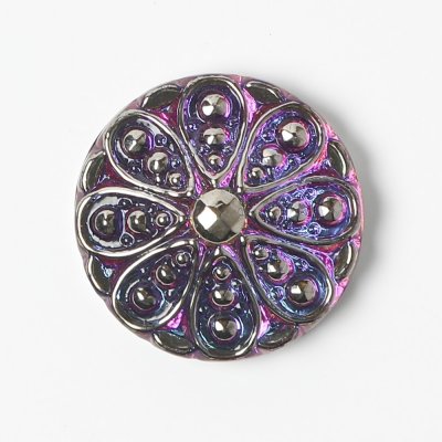 こちらは北チェコのガラスボタン工房で作られている手打ちカボション。直径は約1.8cm。裏から金属塗料が塗布され、奥行きのあるピンクがかったパープルの色です。表面にオプティカルフラワーの細かな模様がシルバーで施されています。陰影の美しい、品のある美しい仕上がりです。手作りのため、陰影が若干ですが異なり、カボションの厚みも少しずつ異なりますのでご留意ください。