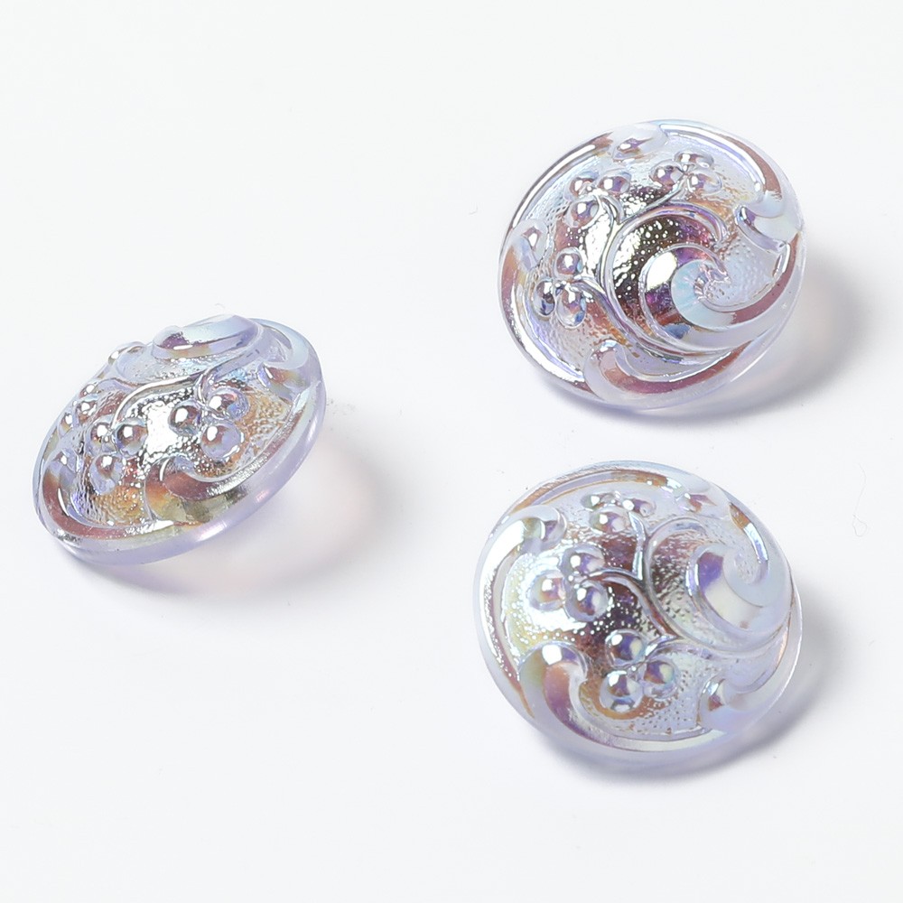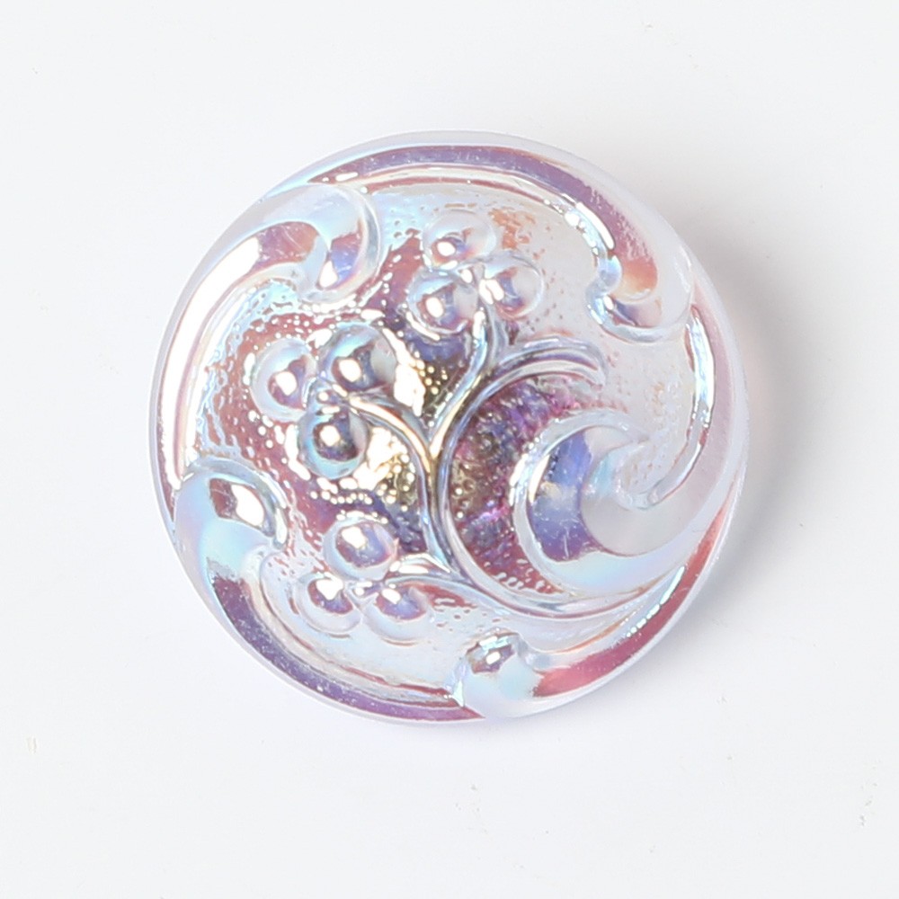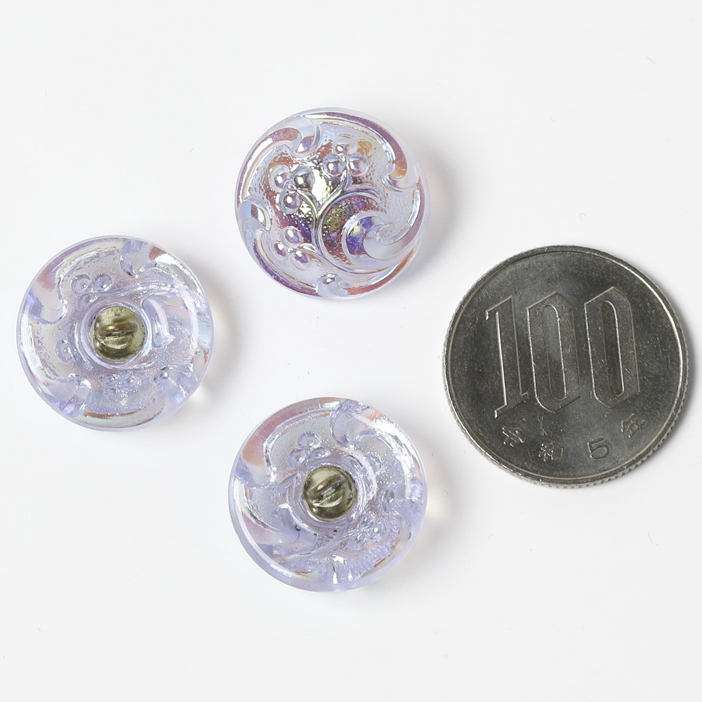 こちらは北チェコのガラスボタン工房で作られている手打ちボタン。こちらのボタンは直径が約1.8cmのボタンです。こちらのボタンは、淡い紫色のガラス製で、中央が盛り上がったポッコリとした形のガラスボタンです。表面にはカーブが特徴的なバロックスタイルの植物モチーフが施されています。また金属塗料が塗布され、ほんのりとブルーやピンクのお色が混じり、大変優雅で美しい色味に仕上がっています。ブローチのような華やかさがあり、髪飾り、アクセサリーの材料などにも素敵です。