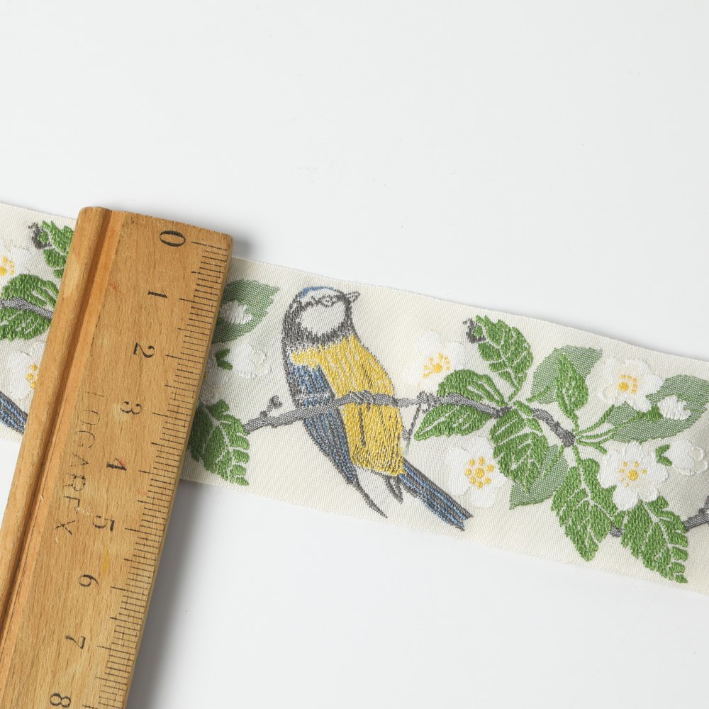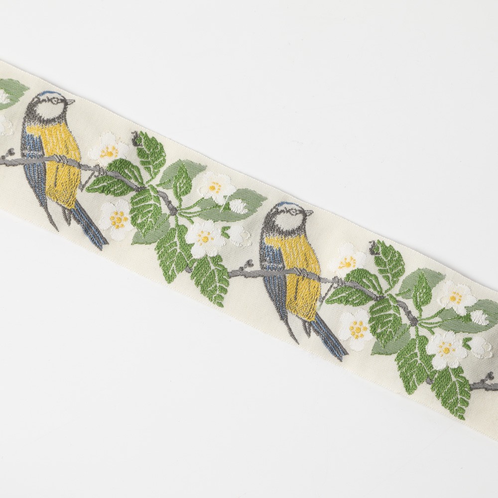 こちらはドイツ製のジャガード織りのリボン。カフカ夫人によって閉鎖された工場の技術が復刻され、今ではカフカリボンとして知られています。幅4cmのリボンです。こちらはりんごの花咲く枝に鳥が宿る美しいお柄のデザインです。100年以上古い織り機を使ってパンチカードにより昔ながらの製法で作られている美しくかわいいリボンです。幅4cmですのでバッグなどにアクセントとして使われると素敵です。直で仕入れていますので、日本で購入いただくよりお求め安い価格でご提供です。素材もコットン90%、ポリエステル10%で品質のよいものです。アイロンがけの際はポリエステルを選択ください。