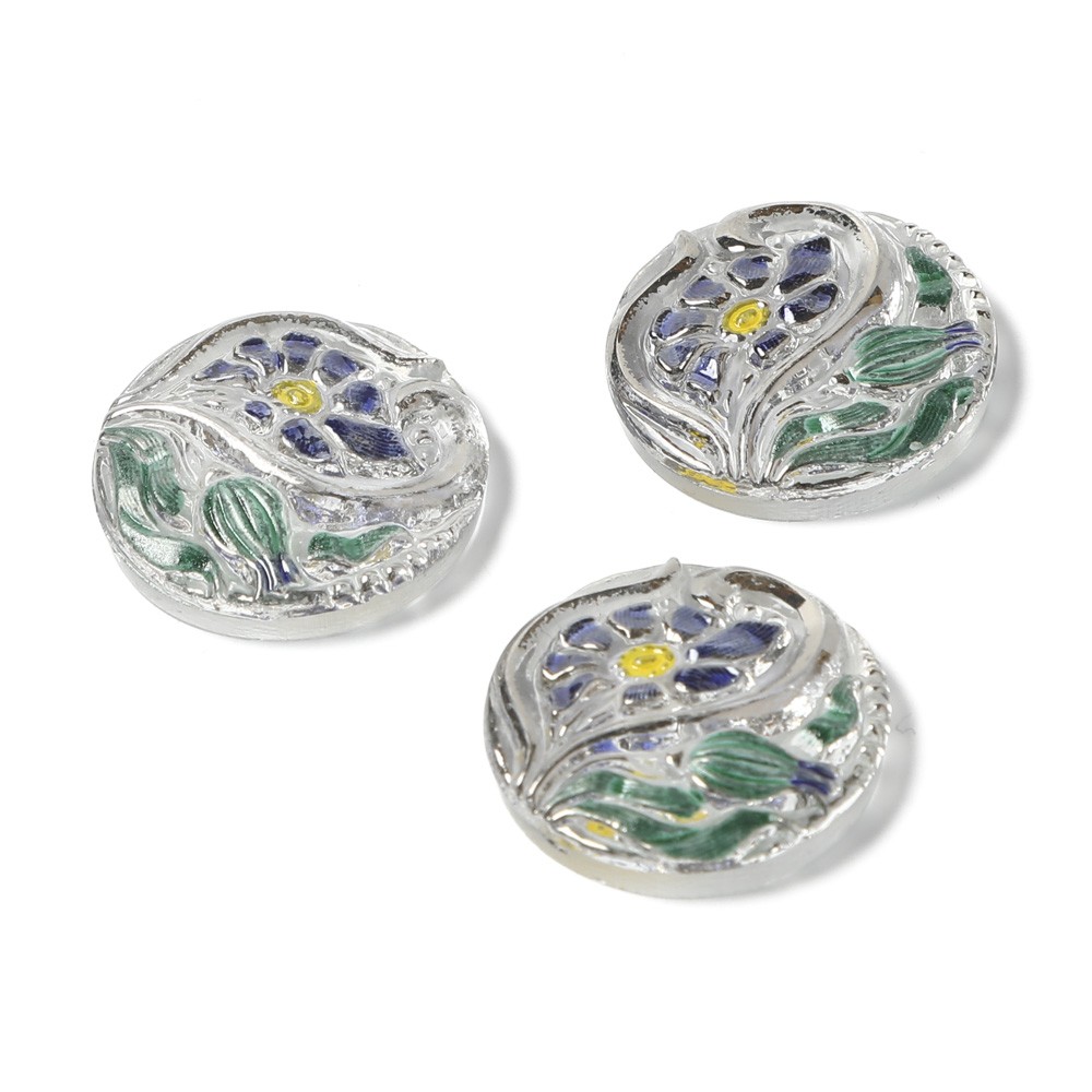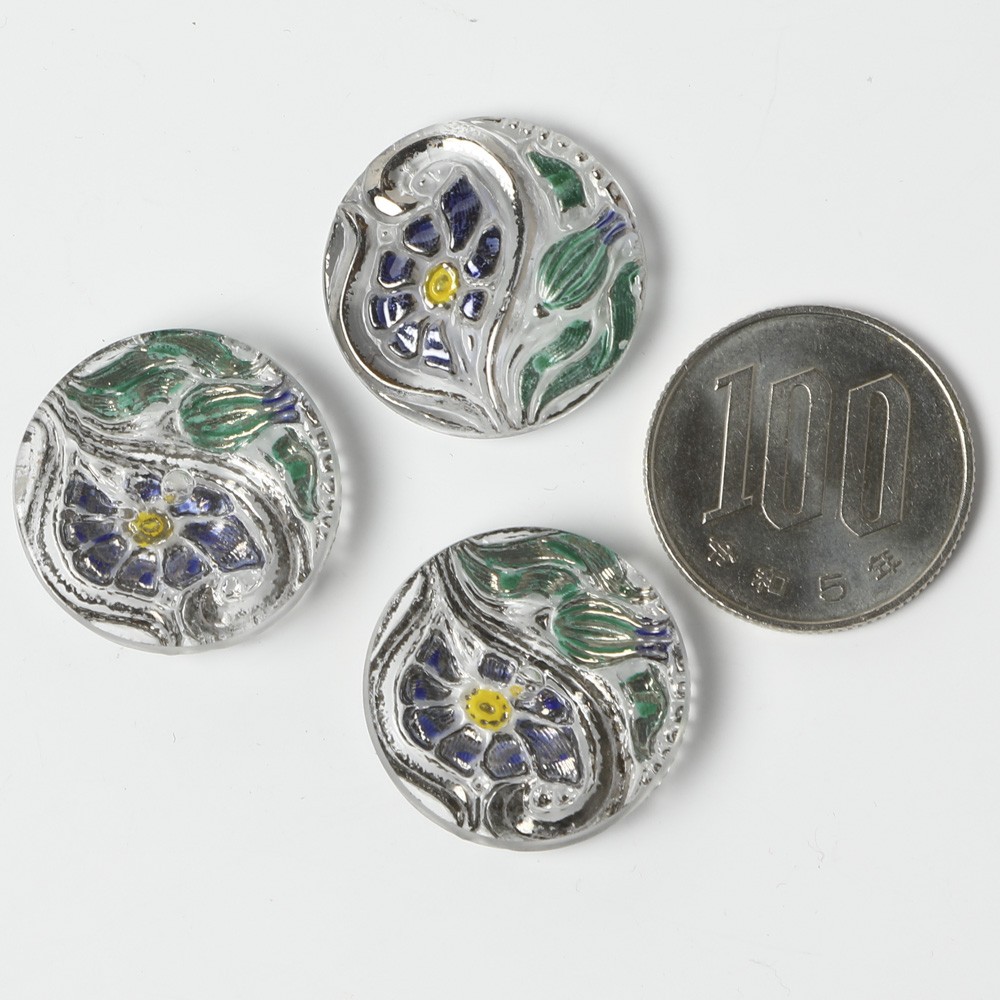 こちらは北チェコのガラスボタン工房で作られている手打ちガラスカボション。直径は約2.2cmです。こちらのボタンは透明なガラス製で、表から優雅な植物文様のモチーフが施されています。青い花にシルバーの金属塗料も塗布されています。涼やかな優しい雰囲気が素敵です。