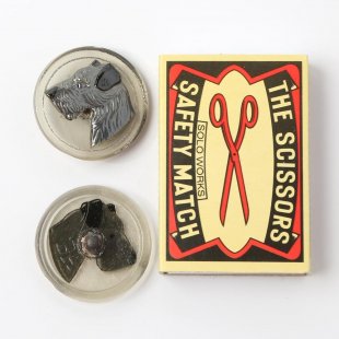 こちらは犬のテリアの横顔のガラスボタン。グレーのテリアでキリッとした男前です。彩度を抑えた薄い黄緑色のガラスで、テリアには手描きでグレーのペイントが施されています。犬が好きな方にもそうでない方にもおすすめです。日本ではなかなか入手困難なデザインのガラスボタンかと思います。(入荷して長期保管を放出しています。)