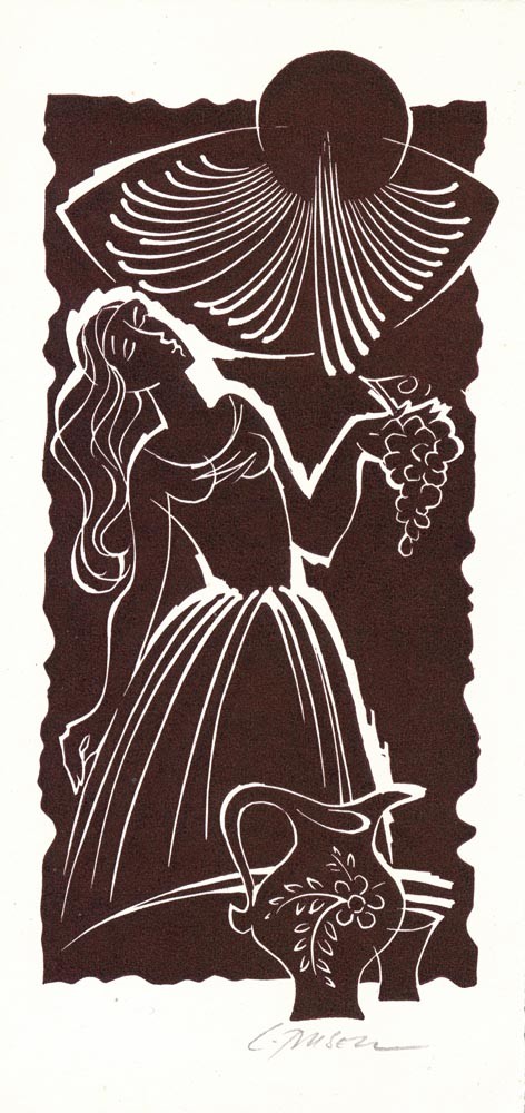 ラヂスラフ・ルセク(1927-2012)はチェコの画家、イラストレーター。30冊の書籍を出版した作家・詩人でもあります。本や雑誌のイラストも担当しました。共産主義化で禁止されながらも生涯を通じ、スカウト運動を本格的に取り組み貢献したことでも知られています。こちらはリノカットで製作された一枚で、少女がブドウを手に太陽を拝む様子が描かれています。太陽の光を浴びて恍惚とした表情が少し官能的です。インクのお色は黒に近い焦茶色です。下部には本人直筆の署名が入っています。年代表記はありませんが、作風から1970年代のものと推測します。近年彼のスカウトとグラフィックの功績を讃える郵便切手も発行され、評価の高まっている作家です。
