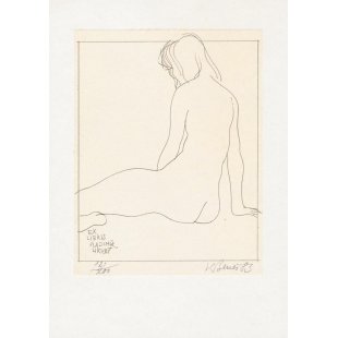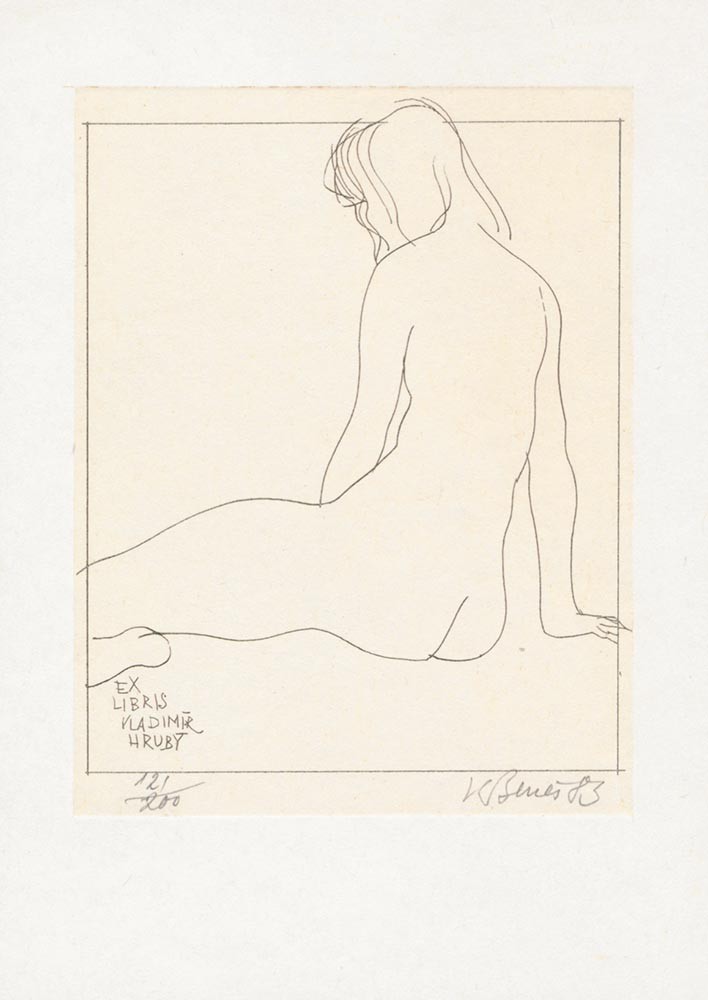 こちらはチェコのイラストレーター、グラフィック・デザイナーのカレル・ベネシュ(1932-2021)の制作したリトグラフ作品です。ウラヂミール・フルビーという人物の為に制作された蔵書票です。ベネシュは女性のヌード作品も数多く制作してきました。細い線描で描かれたモノトーンのもので、ゆったりと寛ぐ女性の後ろ姿が描かれた一枚です。ベネシュは絵本などのイラストも手がけ、チェコ人には馴染み深いイラストレーターで、市場でも人気の高い作家です。ナンバリングは121/200、鉛筆にて本人直筆の署名入りです。台紙に貼られていて、その上から作家が署名しています。額に入れて飾るとおしゃれなインテリアになります。1983年の作品です。