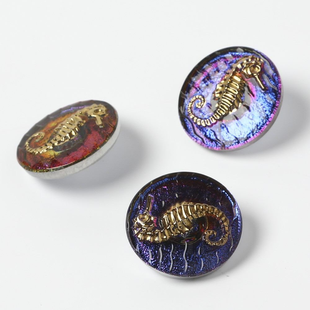 こちらはチェコのガラスボタン工房で制作されているガラスボタン。表面にはタツノオトシゴのモチーフにゴールドの塗料が塗布されていてキュートなボタンです。裏面から金属塗料が塗布され、発色の良いブルーパープルのお色です。角度によってショッキングピンクも見え隠れする華やかな仕上がり。アクセサリーや留め具などにすると素敵です。