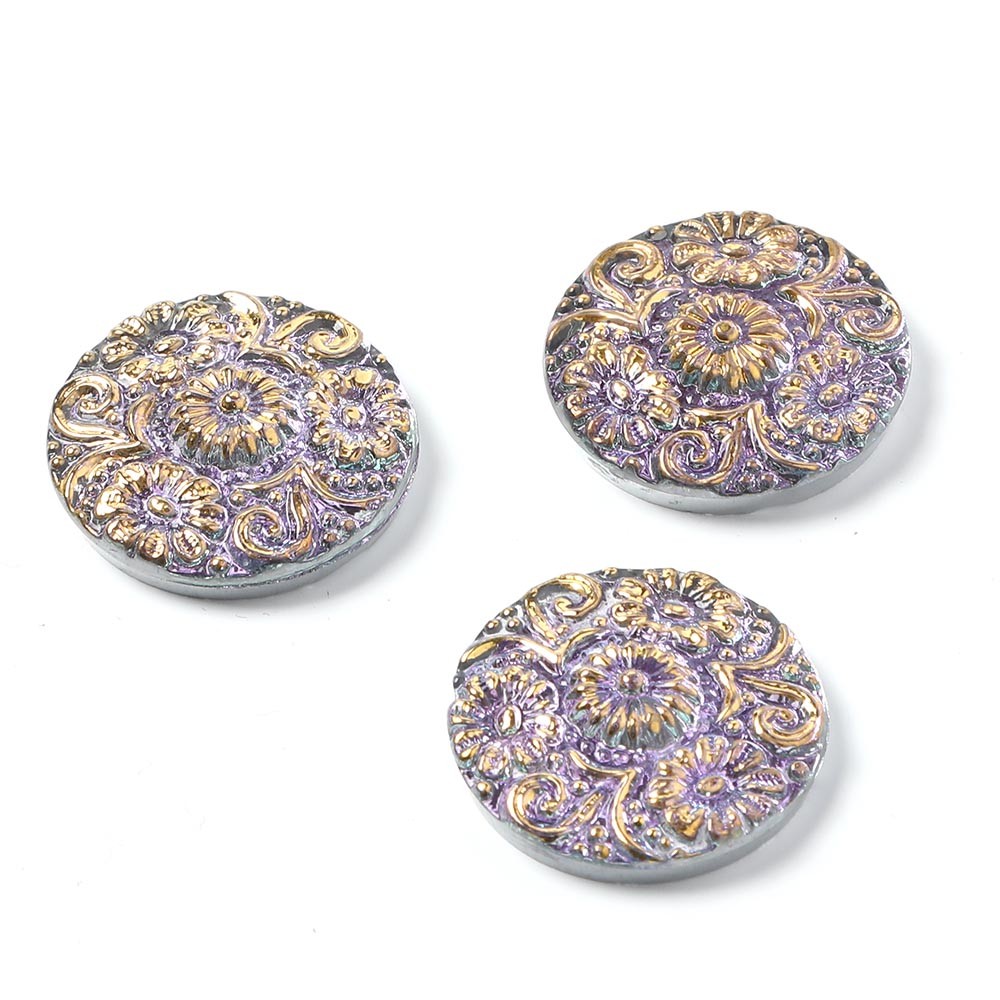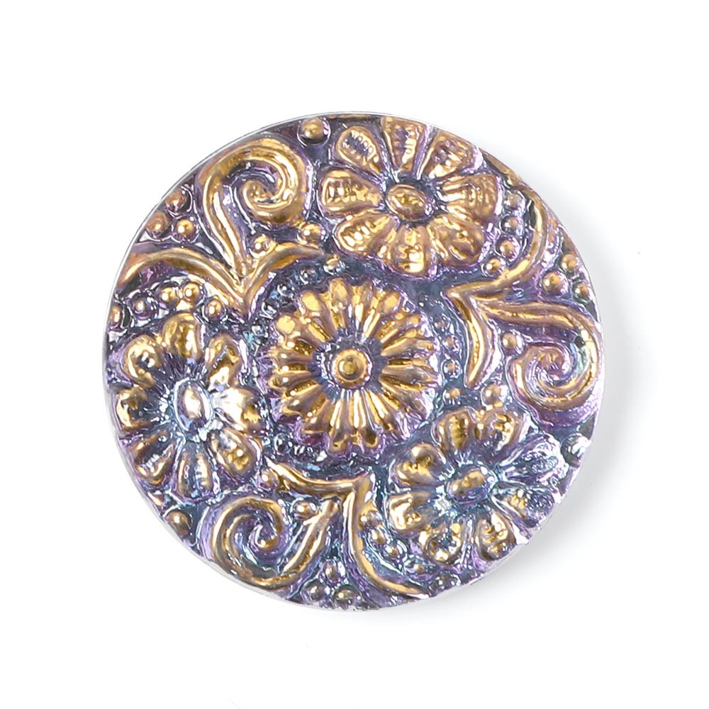 こちらはチェコのガラスボタン工房からのガラス・カボション。裏から金属塗料が塗布され、奥行きのあるピンクパープルのお色です。表面には植物紋様が金彩で施されています。ほんの少しですが、奥にヴィトレイルのカラーニュアンスも見られます。少しオリエンタルな雰囲気もあります。エレガントで華やかな仕上がりです。直径は2.2cm、ブローチに加工したり帯留め、髪留めなどもおすすめです。