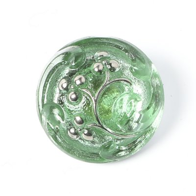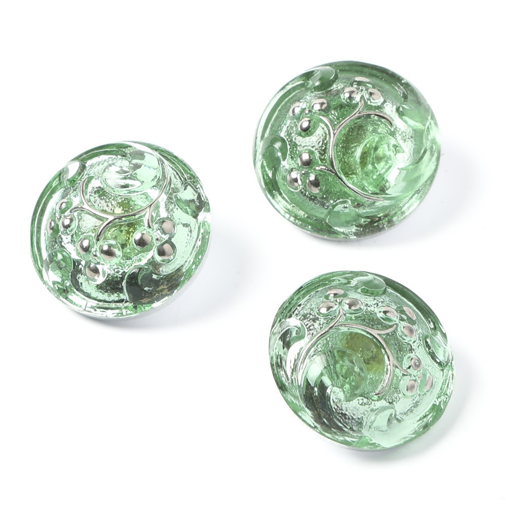 こちらは北チェコのガラスボタン工房で作られている手打ちボタン。こちらのボタンは直径が約1.8cmのボタンです。こちらのボタンは、透明なグリーンのガラス製で、中央が盛り上がったポッコリとした形のガラスボタンです。表面にはカーブが特徴的な植物モチーフが銀彩で施されています。一つ一つ手作業で手間をかけて作られたガラスボタン。またガラス本来の質感のお楽しみいただける涼やかな印象の一品。服のボタンのほか、アクセサリーの材料としてもおすすめです。