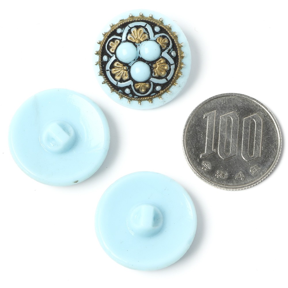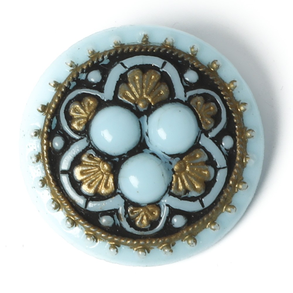 バーボフカが長年コレクションしてきたアンティークのガラスボタンからのお品です。不透明の水色のガラスを使用したボタンで表面にはアンティークらしい意匠を凝らした模様が入っています。ハンドペイントで色付けされ、手作りの温かみのあるガラスボタンです。ガラスボタンはひとつひとつ水洗してあり、ペイントが剥がれなかったものだけ販売しています。詳細は写真でご確認ください。1920年頃のカードに縫いつけてあった100年古いアンティークです。