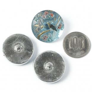 こちらはチェコのガラスボタン工房から鳳凰のモチーフのガラスボタン。分厚い透明なガラスを使用して裏面からは金属塗料が塗られている為、内側からオーシャンブルーの輝きがあります。桃色の花々が咲き乱れ枝の間で2羽の鳳凰が戯れて金彩が施されています。優雅なモチーフで縁起の良さそうなガラスボタンです。:)華やかで帯留や髪飾りにリメイクするのもおすすめです。ブローチのような豪華な存在感のボタンです。