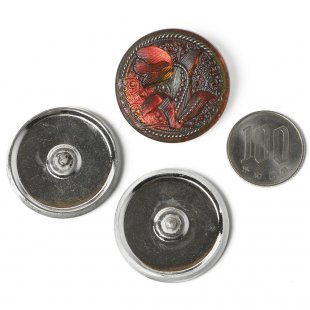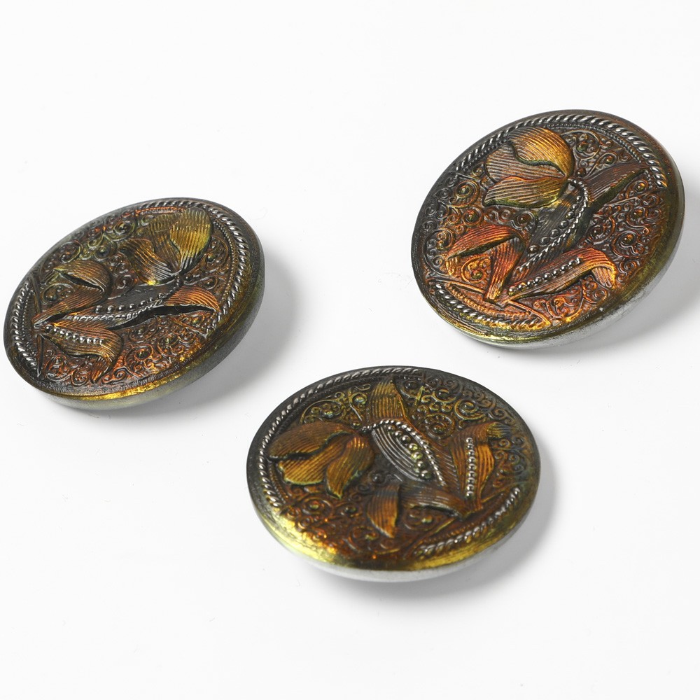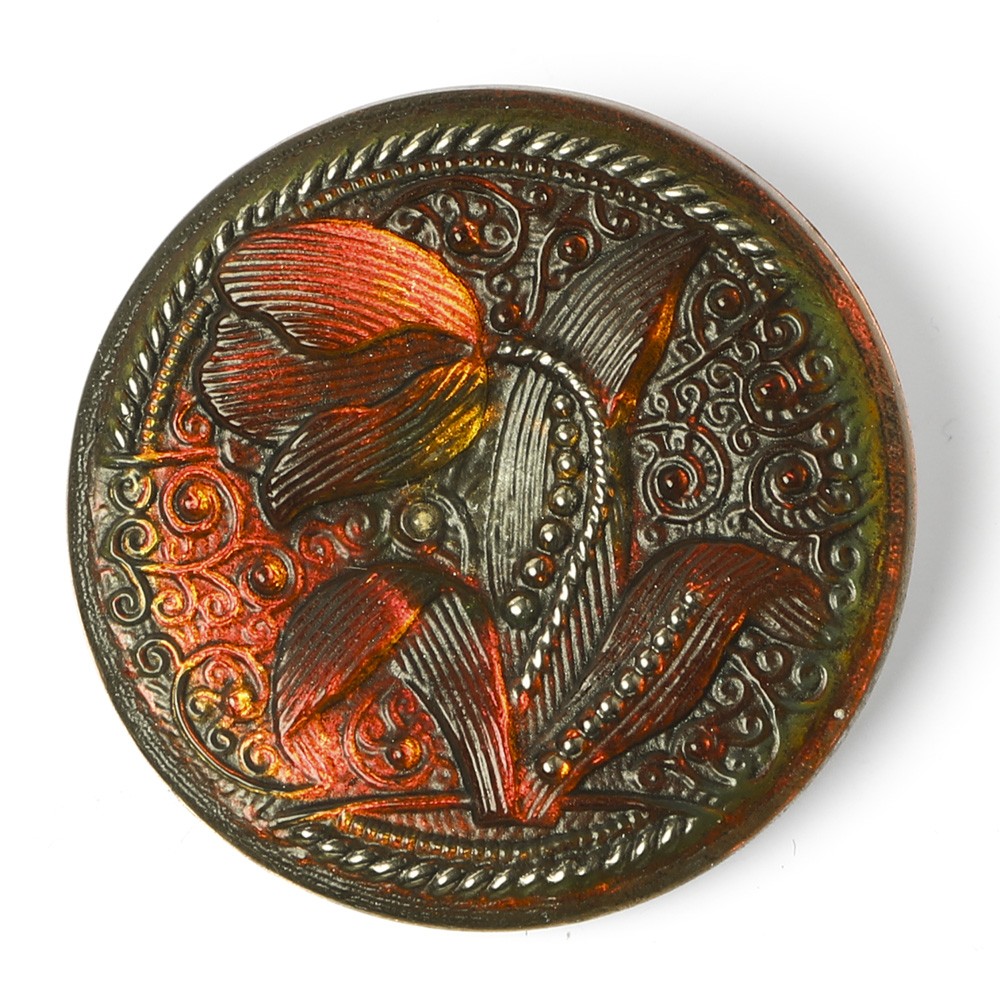 こちらは北チェコのガラスボタン工房で作られている手打ちガラスボタン。直径が約3.2から3.3cmあります。一つ一つ手作業による手打ちで行われ、手間をかけて作られたガラスボタンです。定番のチューリップのデザインです。裏から金属で裏打ちされ、内側から赤味を帯びたブラウンの色に輝きます。角度によって黄色や緑も見え、秋の紅葉のような落ち着いた色合いです。表面の銀彩もエレガントな雰囲気を添えます。ブローチのような貫禄があり留め具などにするととても素敵です。帯留めなどにリメイクするのもありです。