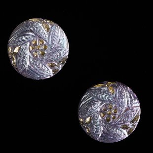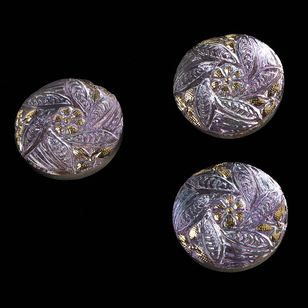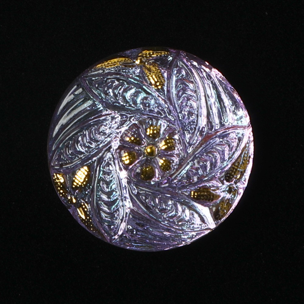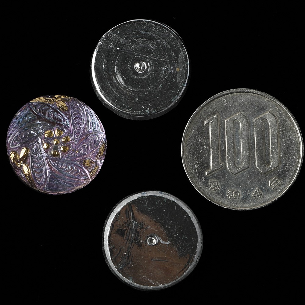 こちらは北チェコのガラスボタン工房で作られている手打ちカボション。直径が約1.8cmあります。打ち出しや彩色も職人さんの手作業で行われるカボションです。旋回する花びらの模様で一部分に金彩で施されています。お色は人気のヴィトレイルのニュアンスのあるパープルのお色です。裏から金属塗料が塗布されています。クールな印象の美しいカボションです。複数購入のお客様にはお色味を揃えるように努力しておりますが、お色には個体差があります。(ピンク色の強いものがあります。)こちらは一個売りのお値段です。