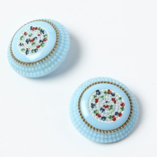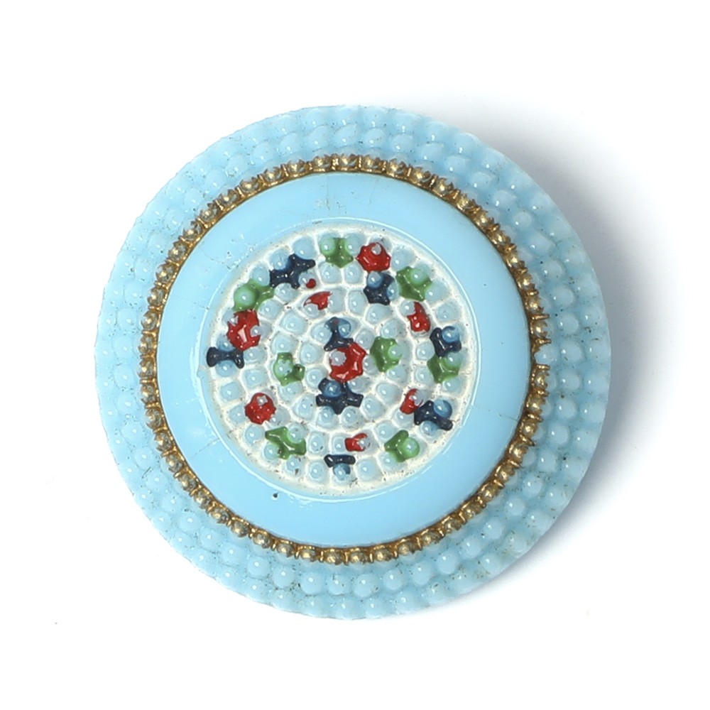 バーボフカが長年コレクションしてきたアンティークのガラスボタンからのお品です。不透明の水色のガラスを使用したボタンで表面にはカラフルな粒々模様が入っています。ハンドペイントで色付けされ、手作りの温かみのあるガラスボタンです。ガラスボタンはひとつひとつ水洗してあり、ペイントが剥がれなかったものだけ販売しています。詳細は写真でご確認ください。1920年頃のカードに縫いつけてあった100年古いアンティークです。裏に不純物の入ったものもございますが、表には見えないものを販売しています。