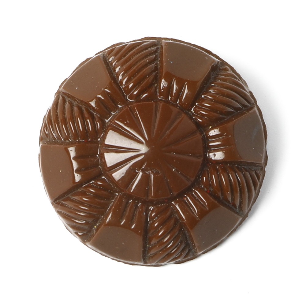 バーボフカが長年コレクションしてきたアンティークのガラスボタンからのお品です。チェコレート色のガラスを使用したボタンでバーボフカのケーキのような形のガラスボタンです。おっとりとしたアンティークらしい表情がキュートで個性的なお品です。1920年頃のカードに縫いつけてあった100年古いアンティークです。
