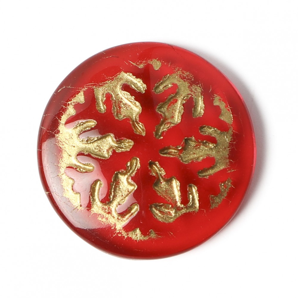こちらはチェコのガラス工房からの新作のガラスカボションです。透明の赤いガラスを使用しています。表面には雪の結晶の模様が入り、ゴールドの塗料が塗布され、コントラストがきれいです。フォルムはひとつひとつ手作りですので、パソコンで描くような完璧な丸ではございませんので、ご了承ください。(写真をご参照ください。)ガラスの国チェコからのとっておきのカボションです。