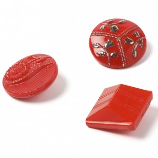 バーボフカが長年コレクションしてきたアンティークのガラスボタンからのお品です。直径2.2cmと四角いボタンは一辺が2cmで赤いガラスのものを3つセットに致しました。それぞれが個性豊かなデザインの楽しいセットです。現行ではどれも入手できない貴重なお品です。