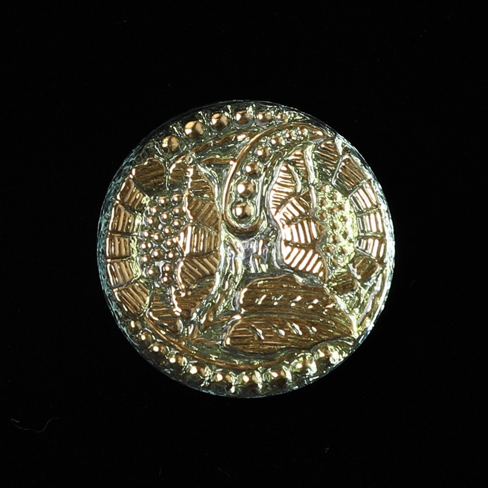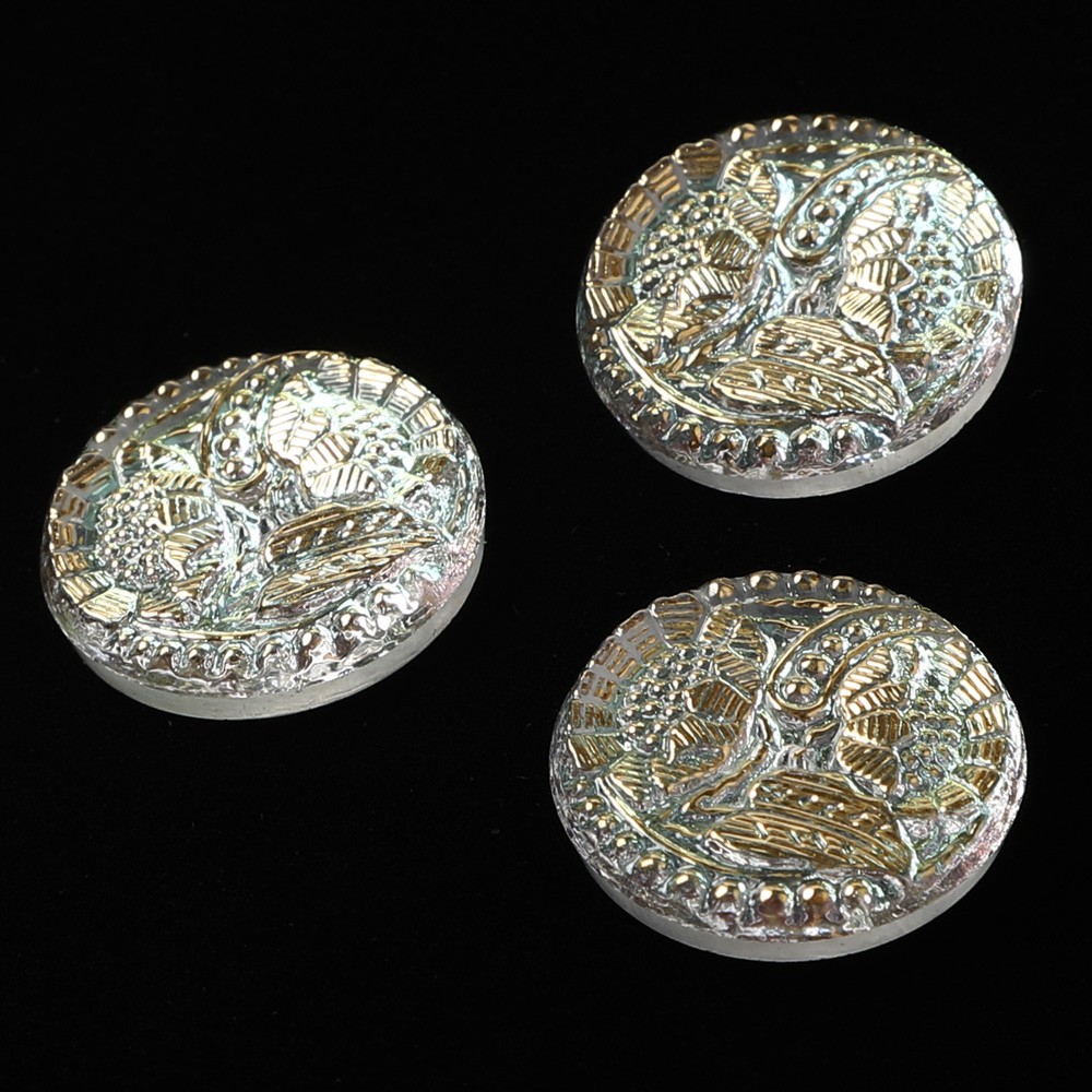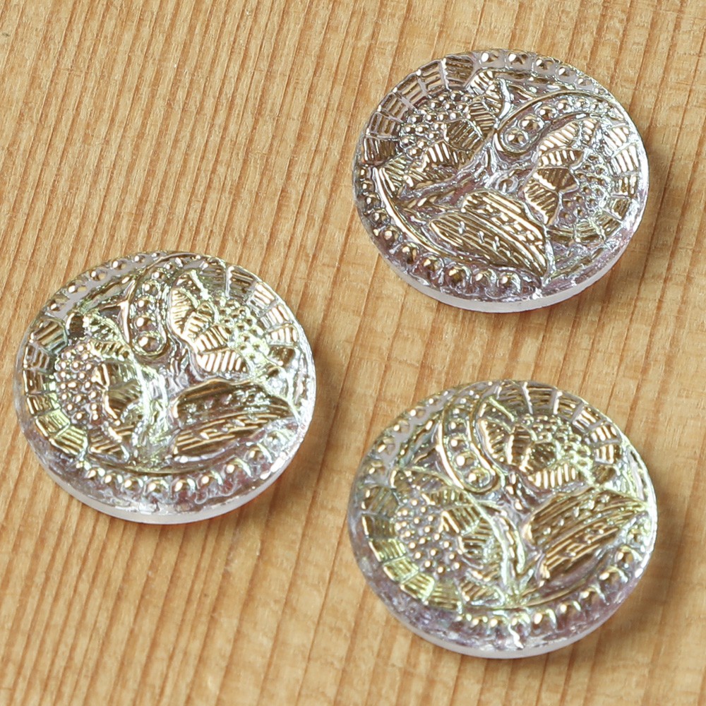 こちらは北チェコでガラスボタン工房で製作されたガラスカボション。ひとつひとつ手で打ち出され彩色も職人さんによる手作業でのものです。直径は1.8cmです。こちらはひまわりモチーフ、裏面には金属塗料が塗布され柔らかなオーロラカラー、角度によってはピンク色にも見える不思議な色合いです。表面には金彩が施されています。華やかでガーリーなお品です。こちらのカボションは裏面の際に小さなかけのあるものがございます。その上から金属塗料が塗布され、工房からは完品として出荷されるものでございます。正面からの見た目としては全く問題ございませんが、ご了承の上ご注文をよろしくお願いいたします。