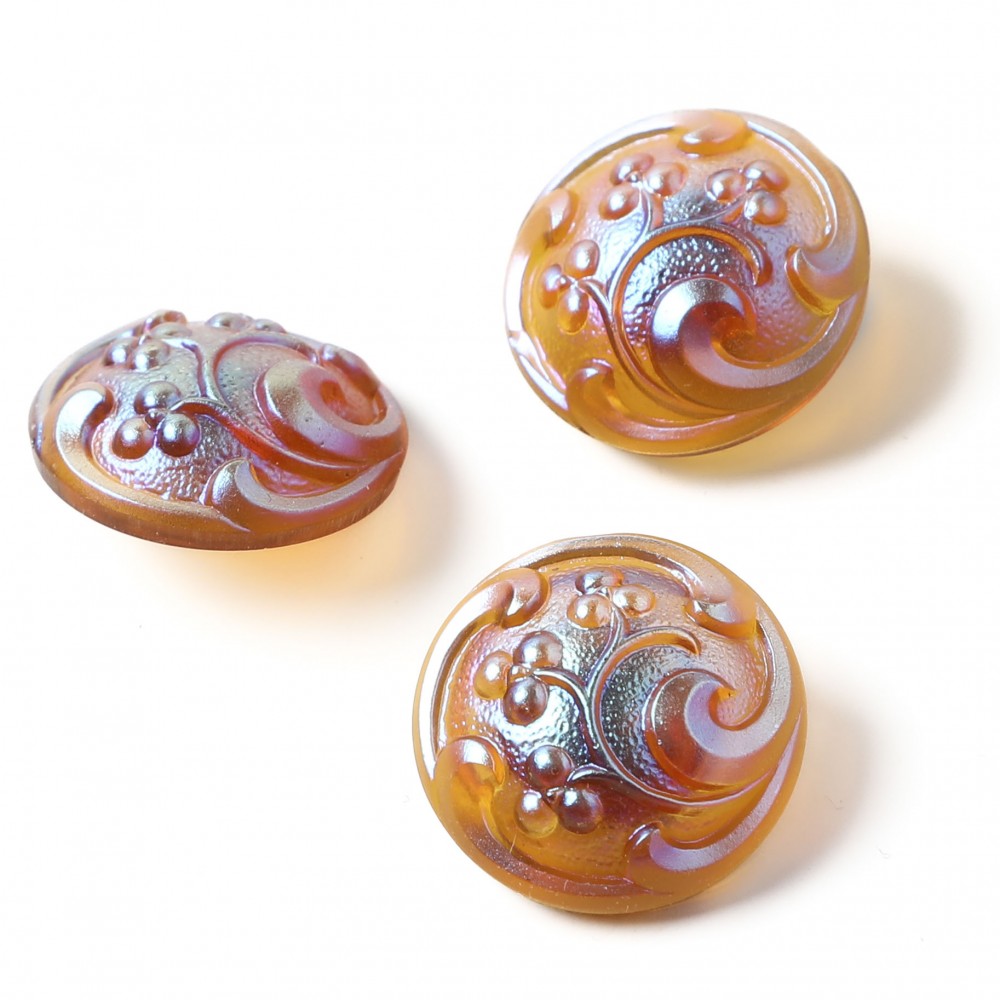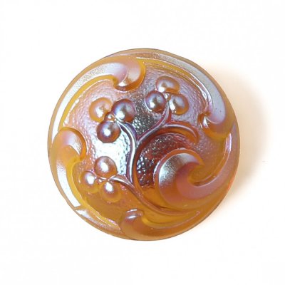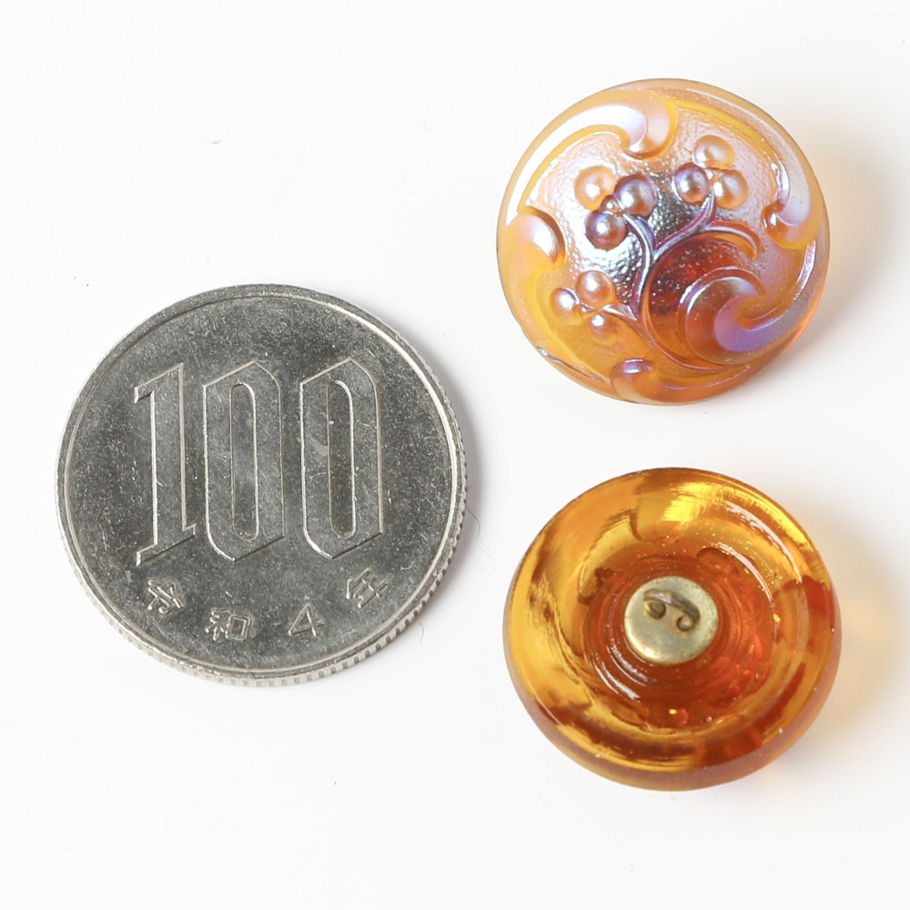 こちらは北チェコのガラスボタン工房で作られている手打ちボタン。直径が約1.8cmのボタンです。こちらのボタンは、透明なブラウンのガラス製で、中央が盛り上がったポッコリとした形のガラスボタンです。表面にはメタリックの塗料が塗布されています。表面にはカーブが特徴的な植物モチーフが金彩で施されています。一つ一つ手作業で手間をかけて作られたガラスボタン。ブローチのような貫禄と華やかさがあり、髪飾り、留め具などにも素敵です。