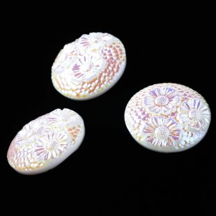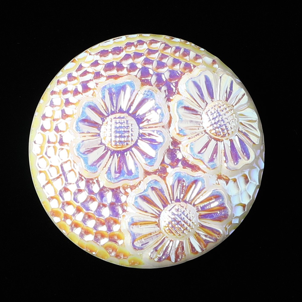 昔ながらの製法で制作されている手打ちガラスボタン。表面にはひなぎくのお花が3つ、また鎚目加工の様な細かな模様がはいっています。乳白色のガラスを使用したボタンで、表面にはうっすらと金属塗料が塗布されていて、少しメタリックな輝くもあります。太陽に反射する雪を思わせるようなお色です。ちょっとアールデコな懐かしい雰囲気も持っているお品です。ブローチや帯留めなどにするのもアイディアです。