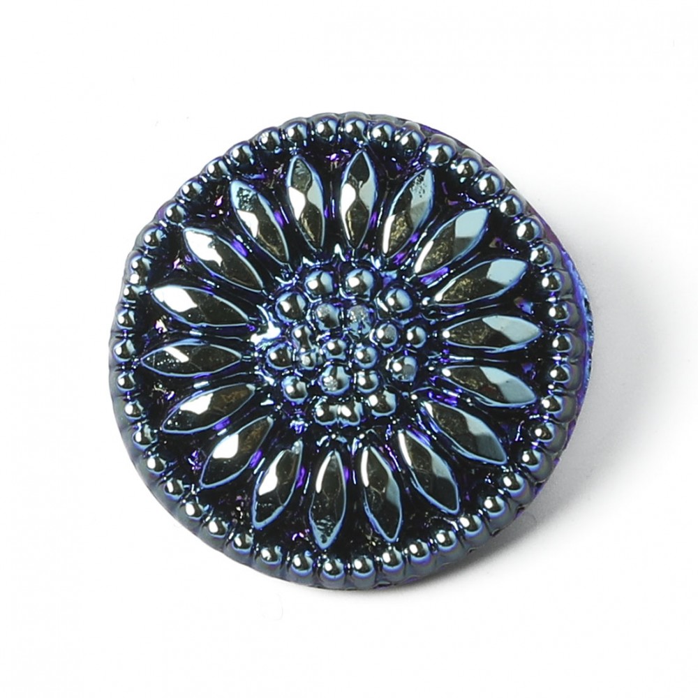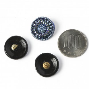 こちらは北チェコのガラスボタン工房で作られている手打ちガラスボタン。ひなぎくのお花のデザインのボタンです。直径は約1.8cmあります。一つ一つ打ち出しや彩色も職人さんの手作業で行われるガラスボタンです。金属塗料が塗布されメタリックブルーのお色です。冴えた耀きが美しいキリッとした印象のガラスボタンです。