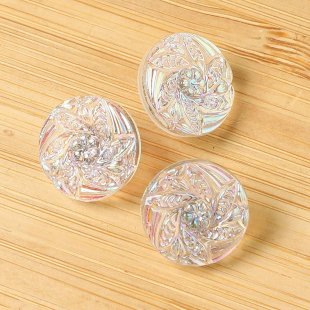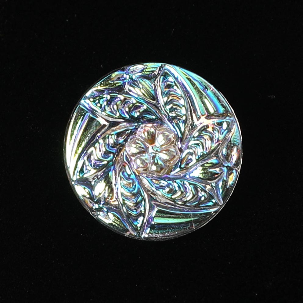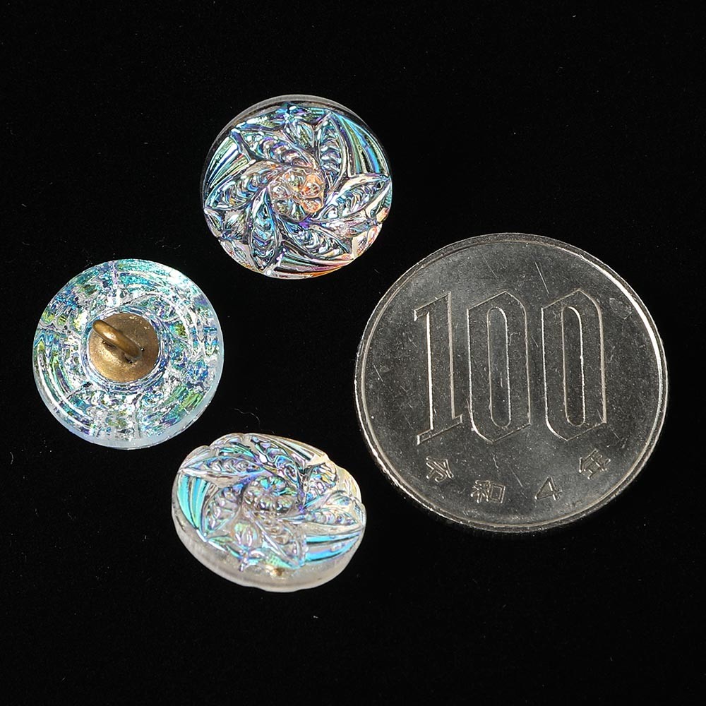 花ぐるまのデザインのガラスボタン。直径は1.3cmの小さなボタンです。透明のガラスの表面にはうっすら金属塗料が塗布され、メタリックオーロラホワイトのお色に仕上がっています。すずやか、華やかなボタンです。背景のお色で色味をかなり変えます。(写真をご参照ください。)
