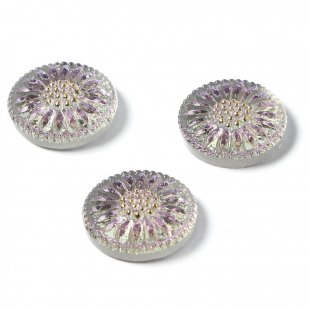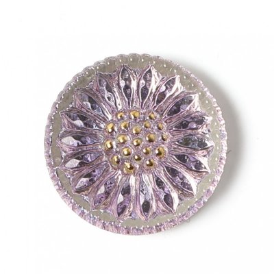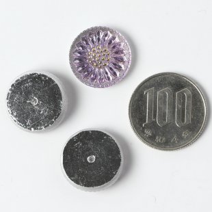 こちらはチェコのガラスボタン工房で製作されている手打ちのガラスカボションです。直径が約1.8cmあります。打ち出しや彩色も職人さんの手作業で行われています。ひなぎくのモチーフで裏から金属塗料が塗布され、奥行きのあるピンクパープルのお色です。おしべには手作業で金彩も施され、柔らかな雰囲気のフェミニンな一品です。複数写っている写真もありますが、こちらは1個での販売になります。こちらはカボションですので、裏面はボタン通しがなく、平らですのでアクセサリー作りの材料としては便利かと思います。