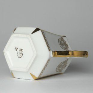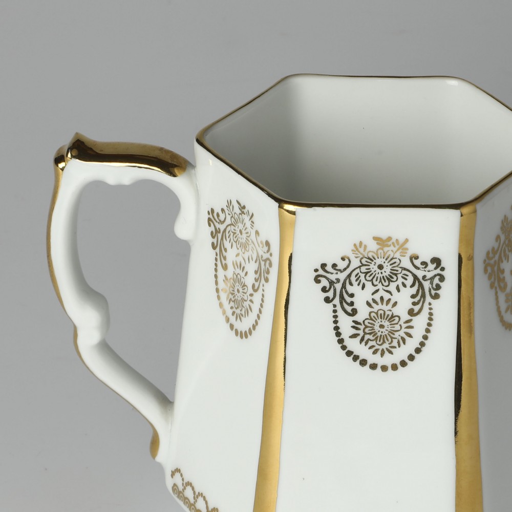 こちらはチェコスロヴァキア時代のポルツエラーン製ヴィンテージ・マグカップ。当時ものではありませんが、セセッション様式を持つ六角形のマグで、チェコスロヴァキアの磁器メーカー、JSK社の製品です。本物のゴールドを使用した金彩が白磁にエレガントで華やかです。小さめで日本人のサイズにはおすすめです。使用頻度は少なかったようで、状態も大変良いものです。1950年代頃のお品です。インテリア棚の飾りにもなるような優雅な美しい一品、チェコからのとっておきです。