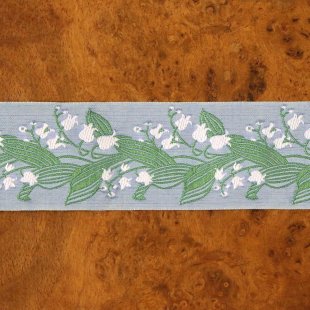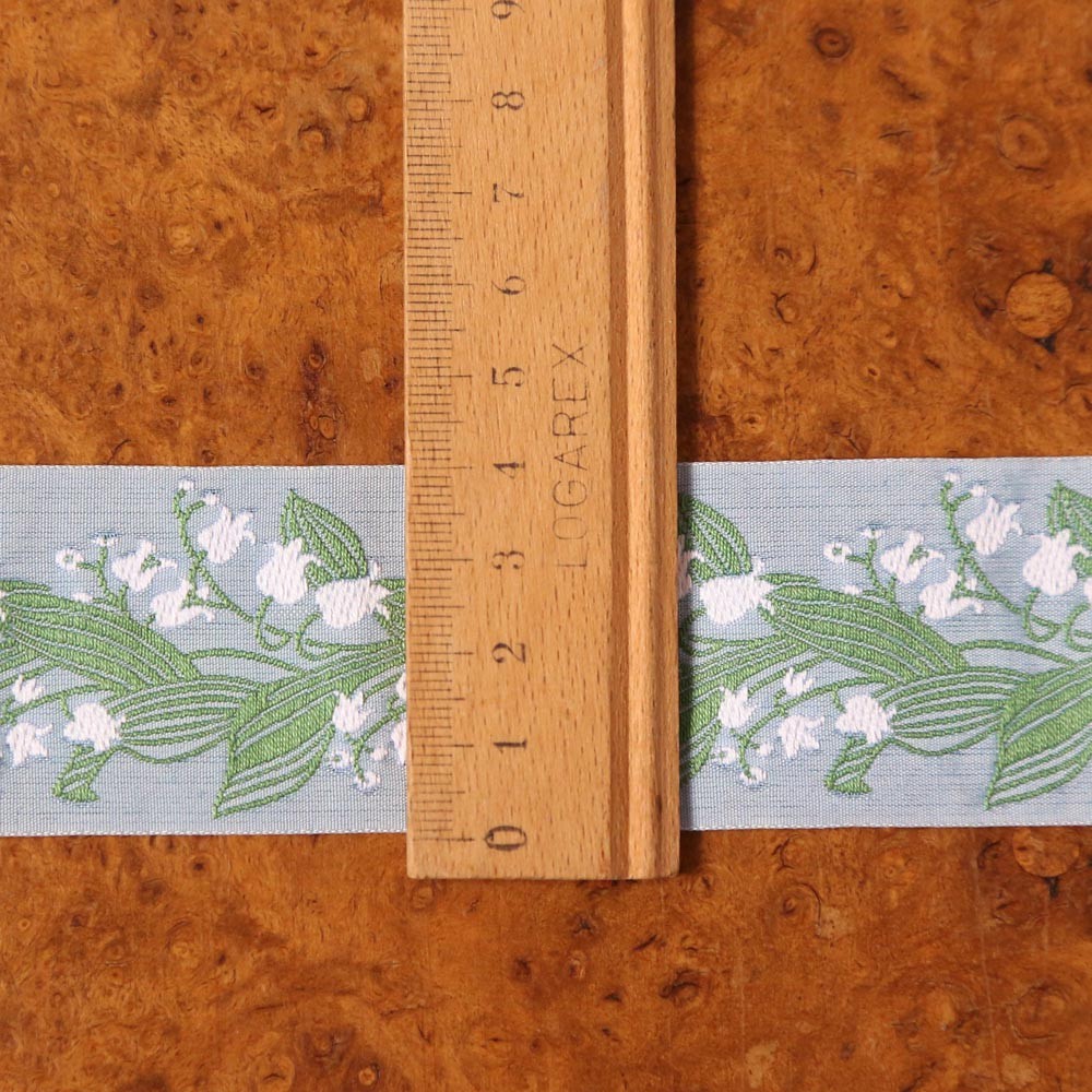 ドイツ製カフカ・リボン ジャガード織り グレーブルーにすずらん 幅4cm 156cm売り切り