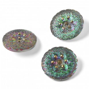 こちらは北チェコのガラスボタン工房で作られている手打ちボタン。こちらのボタンは直径が約2.7cmの大きなボタンです。透明のガラスを使用し、表面には大変繊細なお花の模様の優雅な雰囲気。中央の金彩のドットが華やかさを添えます。裏から金属塗料が塗布されていて、内側から深いグリーンのお色です。アクセサリーや帯留め、お洋服のボタンにするのもおすすめです。