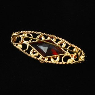 こちらはチェコスロヴァキア時代のヴィンテージ・ブローチ。小さなリングが折り重なって長い楕円形の台座の中央には菱形の赤いカットガラスが配置されています。ゴールドとレッドのカラーコンビネーションが華やかな雰囲気です。1960-70年頃の古いものですが状態も良好です。
